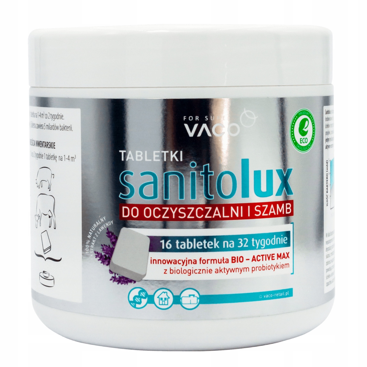 Биологический препарат для очистных сооружений бытовых сточных вод и септиковв форме таблеток. Применяется для разложения органических загрязнителей в септиках и отложений в канализационных системах. Предназначен для использования в домашних условиях, небольших гостиницах и ресторанах. Поддерживает естественные процессы очистки сточных вод и активирует возможность их регенерации. Удобен в использовании – выдается через унитаз. Не вызывает коррозии и повреждения сантехнического оборудования. Безопасен для людей, животных и окружающей среды. Обогащен экстрактом лаванды. Экономичной упаковки хватает на 32 недели.Sanitolux — единственный продукт этого класса, содержащий наиболее эффективные штаммы бактерий, вырабатывающих активные ферменты.
