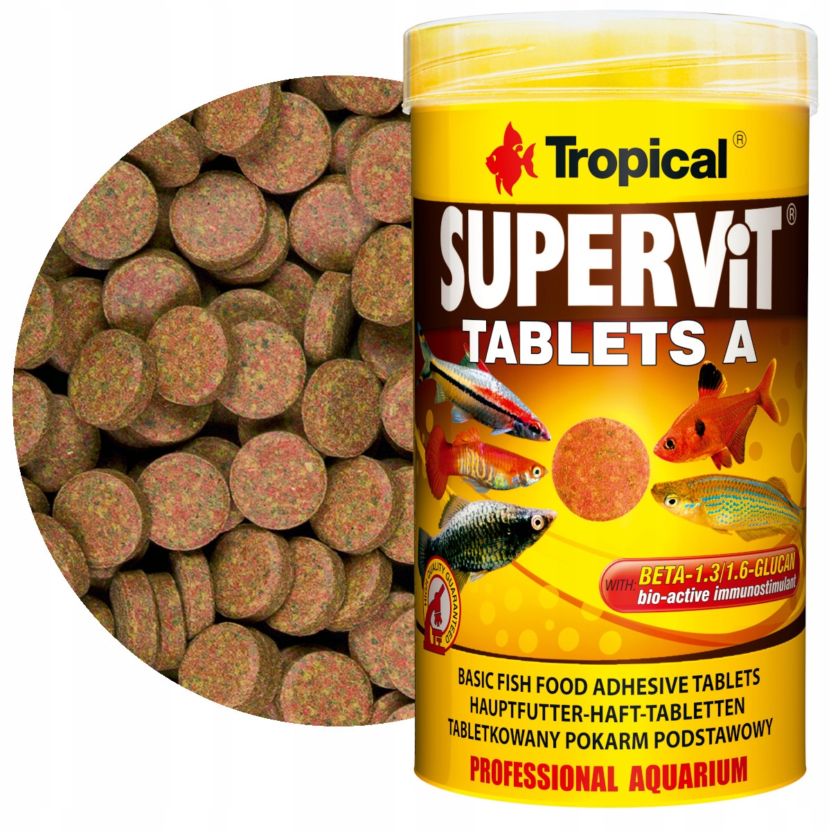 Tropical Supervit Tablets A выпускается в форме небольших таблеток. После добавления в аквариум они падают на дно, где становятся пищей для рыб, активных в нижней зоне аквариума. Вы также можете приклеить их к боковому стеклу аквариума, благодаря чему они доберутся до видов, питающихся в средней и верхней части аквариума. Тропический корм предназначен для рыб мелкого и среднего размера. Вы также можете кормить им креветок, улиток и черепах.