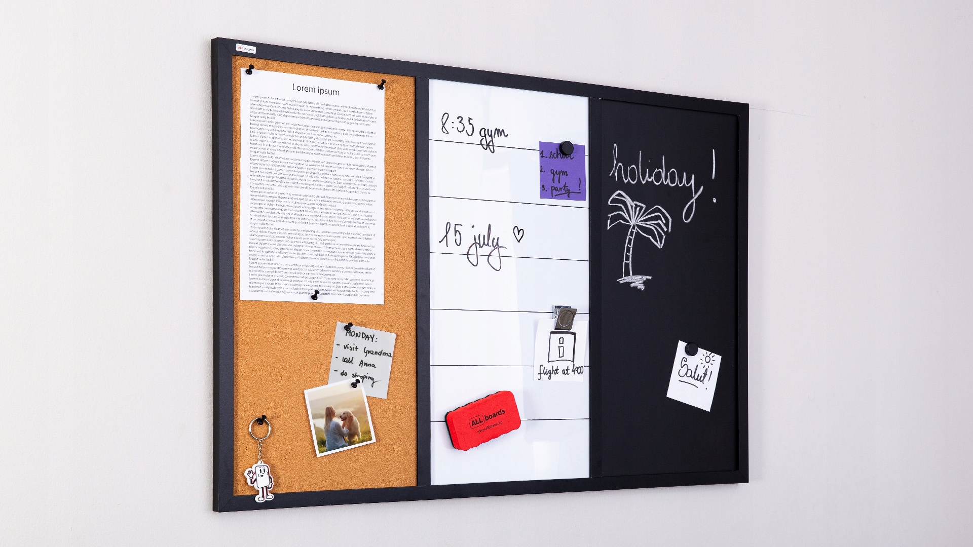 Многофункциональная доска COMBI позволяет полноценно использовать три разные поверхности одновременно, без необходимости покупать несколько досок. Это идеальный инструмент для организации вашей повседневной деятельности. На белой стираемой поверхности пишите сухостираемыми маркерами, на меловой поверхности — мелом или меловыми маркерами, а заметки прикрепляйте к пробковой доске булавками или булавками. Кроме того, до двух поверхностей можно прикрепить магниты любого типа.