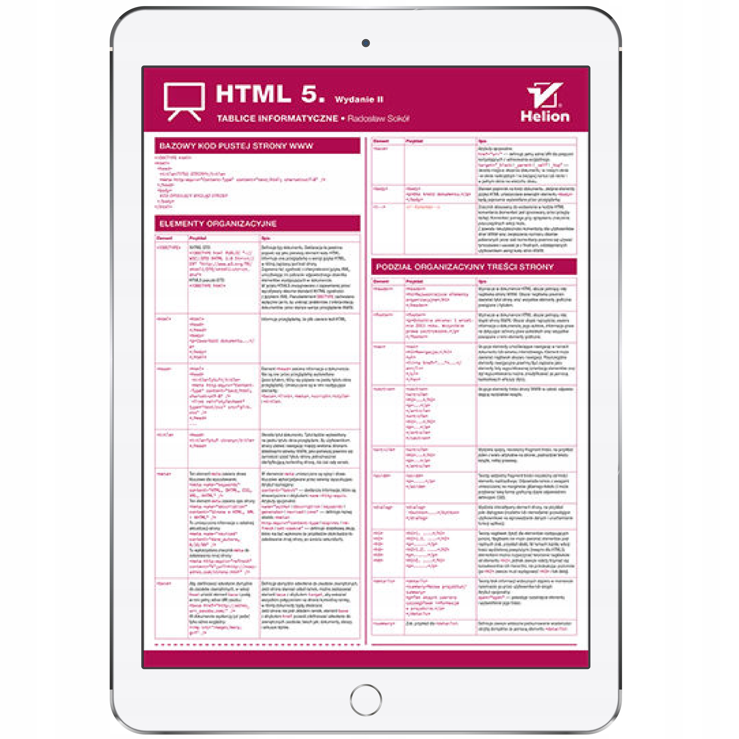 Оплачивая «Tablice informatyczne. HTML 5», вы можете быть уверены, что данное изделие из каталога «Информатика, интернет» будет доставлено из Польши и проверено на целостность. В цене товара, указанной на сайте, учтена доставка из Польши. Внимание!!! Товары для Евросоюза, согласно законодательству стран Евросоюза, могут отличаться упаковкой или наполнением.