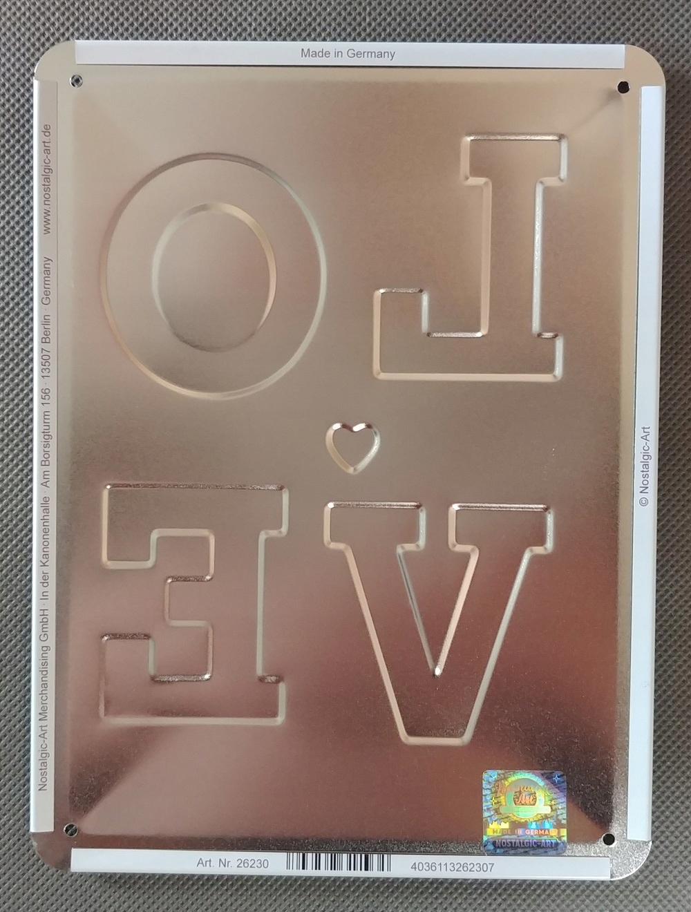 Nostalgic-Art уделяет большое внимание качеству производства в Германии металлических вывесок и всех других предлагаемых гаджетов. Все изделия из белой жести изготавливаются из прочной листовой стали и обычно имеют одно замысловатое рельефное изображение. Используя новейшие технологии производства и глобальную дистрибуцию больших партий, мы предлагаем отличное соотношение цены и качества.
