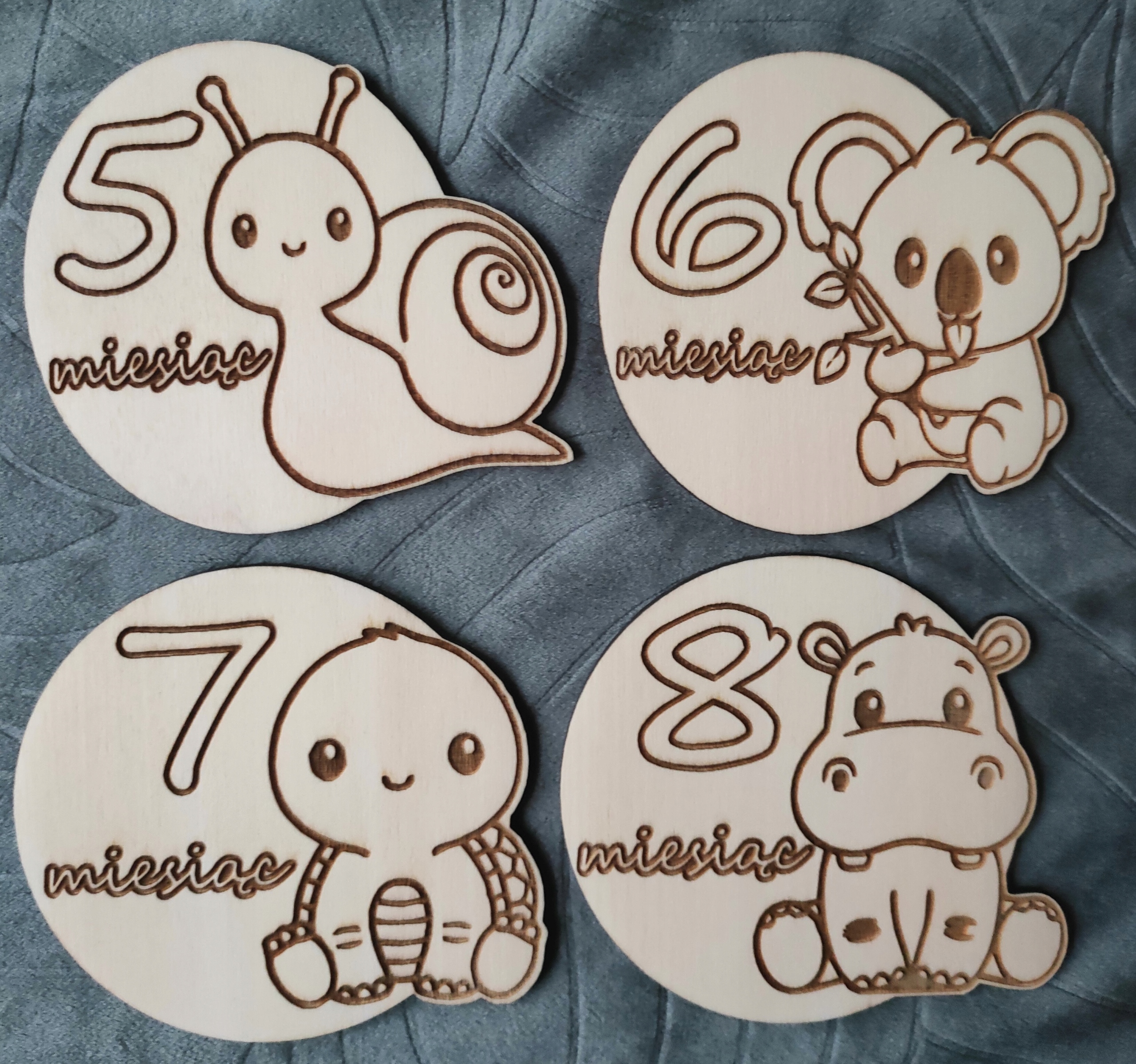 Красивые, аккуратно сделанные деревянные фотокарточки, документирующие первый год жизни ребенка, с оригинальными узорами, украсят любой альбом.