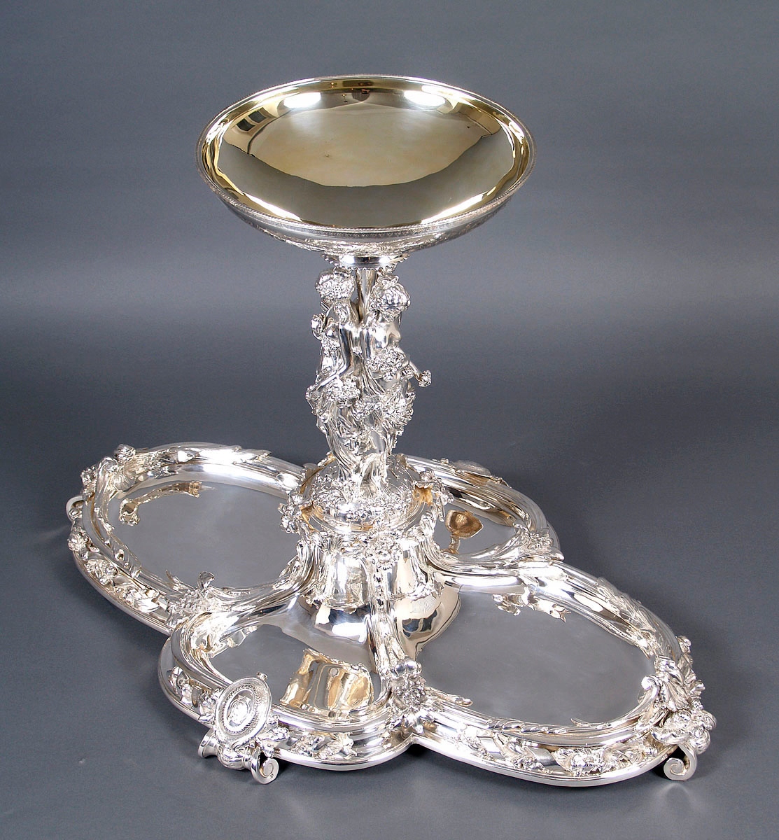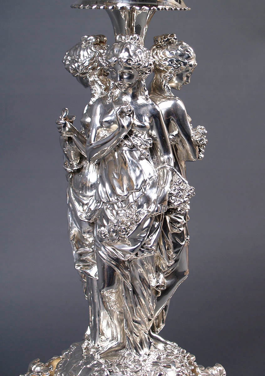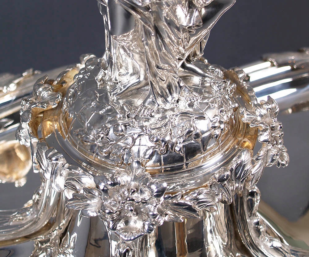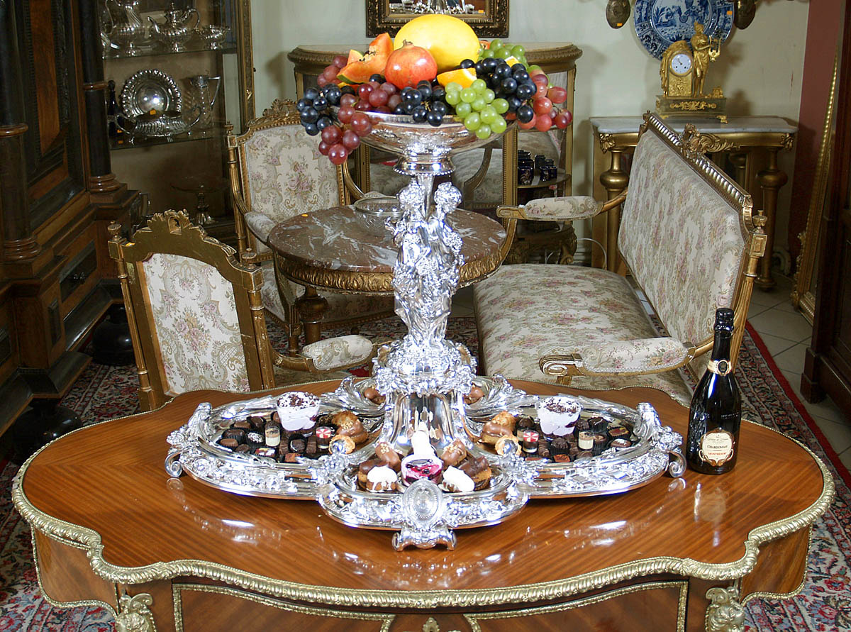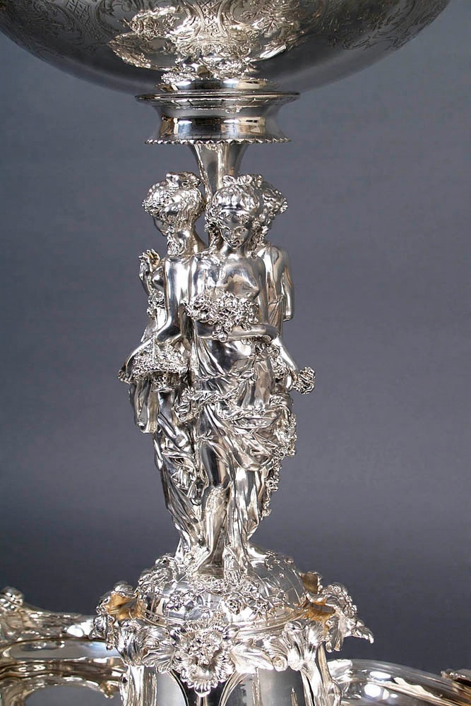 Surtout de table, большая, декоративная, очень качественная центральная часть стола. Основание состоит из четырех плоских чаш: двух меньших размеров спереди и сзади и двух больших овальной формы по бокам. Профилированный и вогнутый по всей окружности, украшенный цветками розы с листьями, расположенными на плоской, спирально закрученной ленте. На более широких сторонах расположены цветочные композиции, а над ними в навершии - листья аканта, частично распростертые в стороны. В местах их соединения чаша украшена плодами винограда, покоящимися на крупных листьях со стеблями, идущими вертикально вверх, создавая фигуре цветочный постамент. Вверху, на возвышении, с параллельными линиями и многочисленными цветами выгравированы три грации. Стоят спиной к спине, босиком, в струящихся одеждах, обнажающих плечи и грудь. В руках они держат корзину с фруктами, цветами и кувшин с вином. Головы у них слегка опущены, волосы собраны в пучки, локоны слегка спущены на плечи, на лицах светлая улыбка. Между ними имеется расширенный вверху вал, на котором закреплена полированная и позолоченная чаша. На внешней стороне вырезаны цветочные узоры, состоящие из двенадцати полей, последовательно соединенных друг с другом. Все это поддерживается четырьмя массивными двойными ножками, которые выдерживают большой вес объекта. На двух ножках спереди и сзади - овальные медальоны, окруженные венком из нежных листьев и выгравированной в центре буквой Н.
