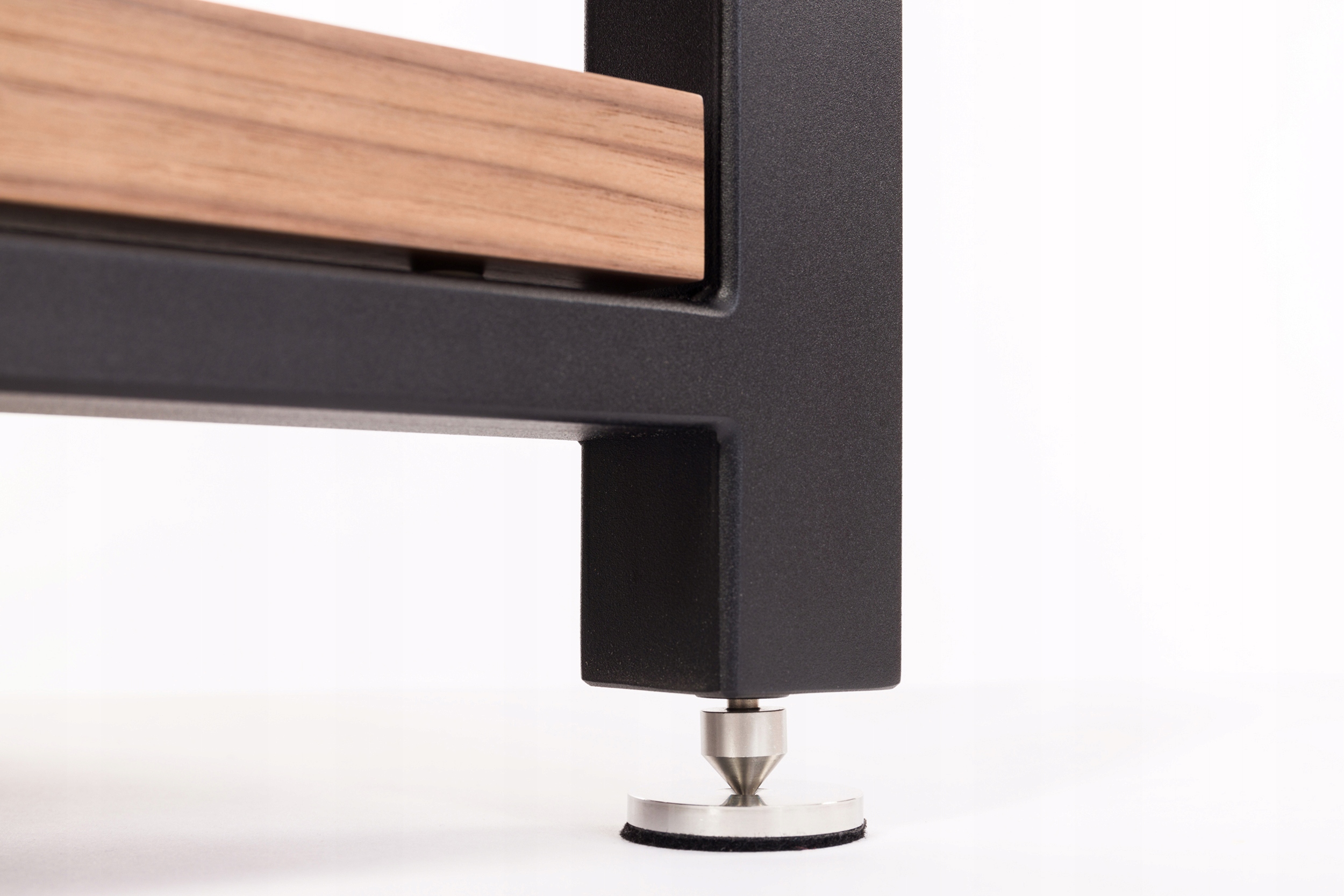 Антивибрационные таблицы предназначены для высококлассных аудиокомпонентов. Конструкции были настроены подходящей комбинацией сплава и высокоуглеродной стали. Рамка состоит из толстых ножек, изготовленных из углеродистой стали S235JR (используемые для нагрузочных конструкций, подвергшихся высоким динамическим нагрузкам -например, в кранах) и соединяющих сплавных стальных перекладок с повышенной прочностью S355. Точные уровни выполняются с использованием регулируемых антиваибрационных конусов.