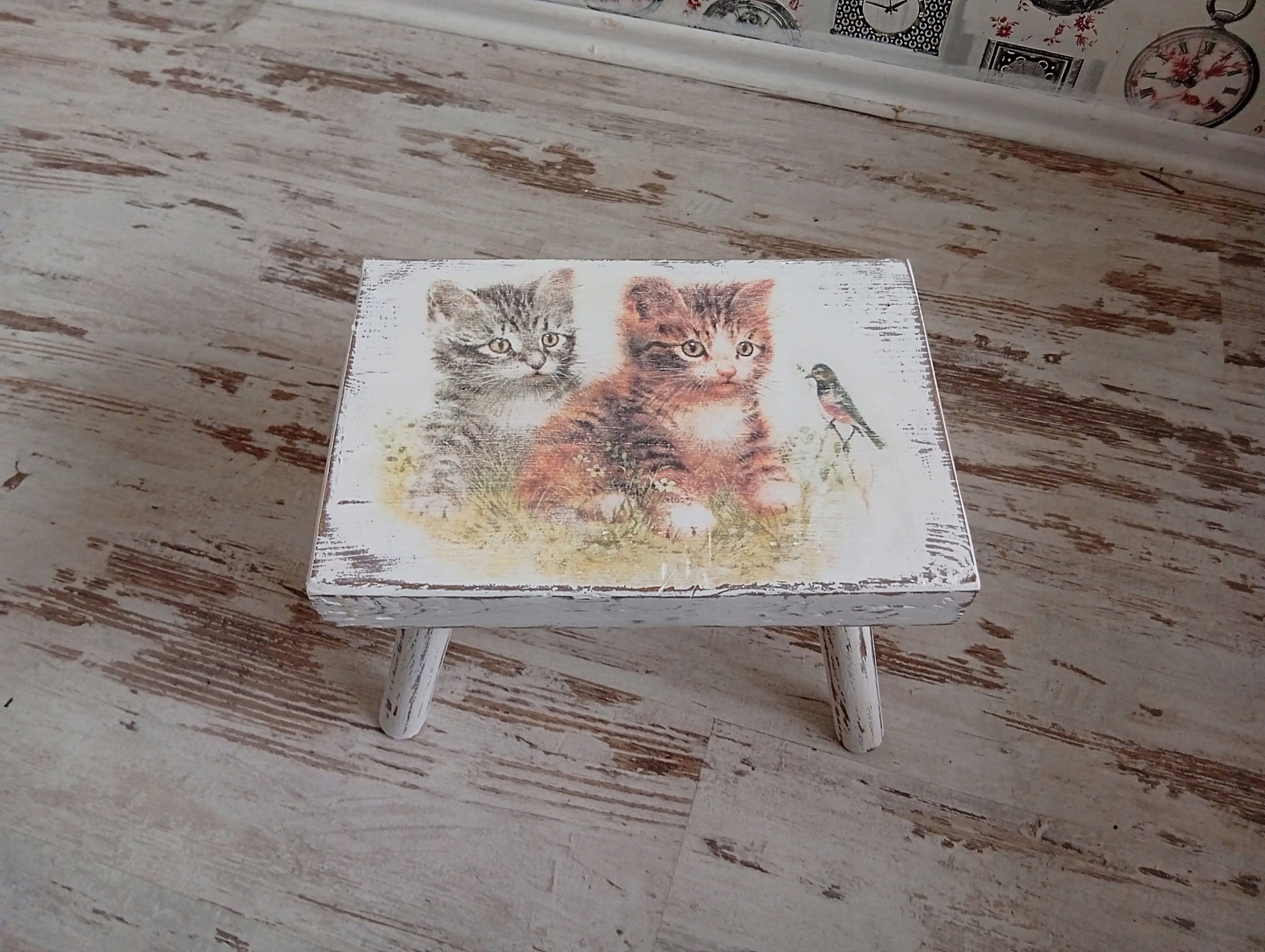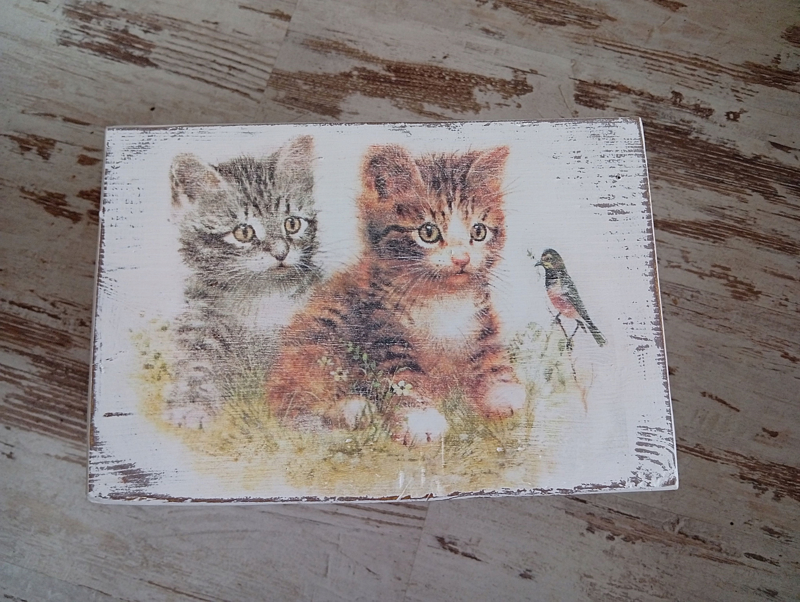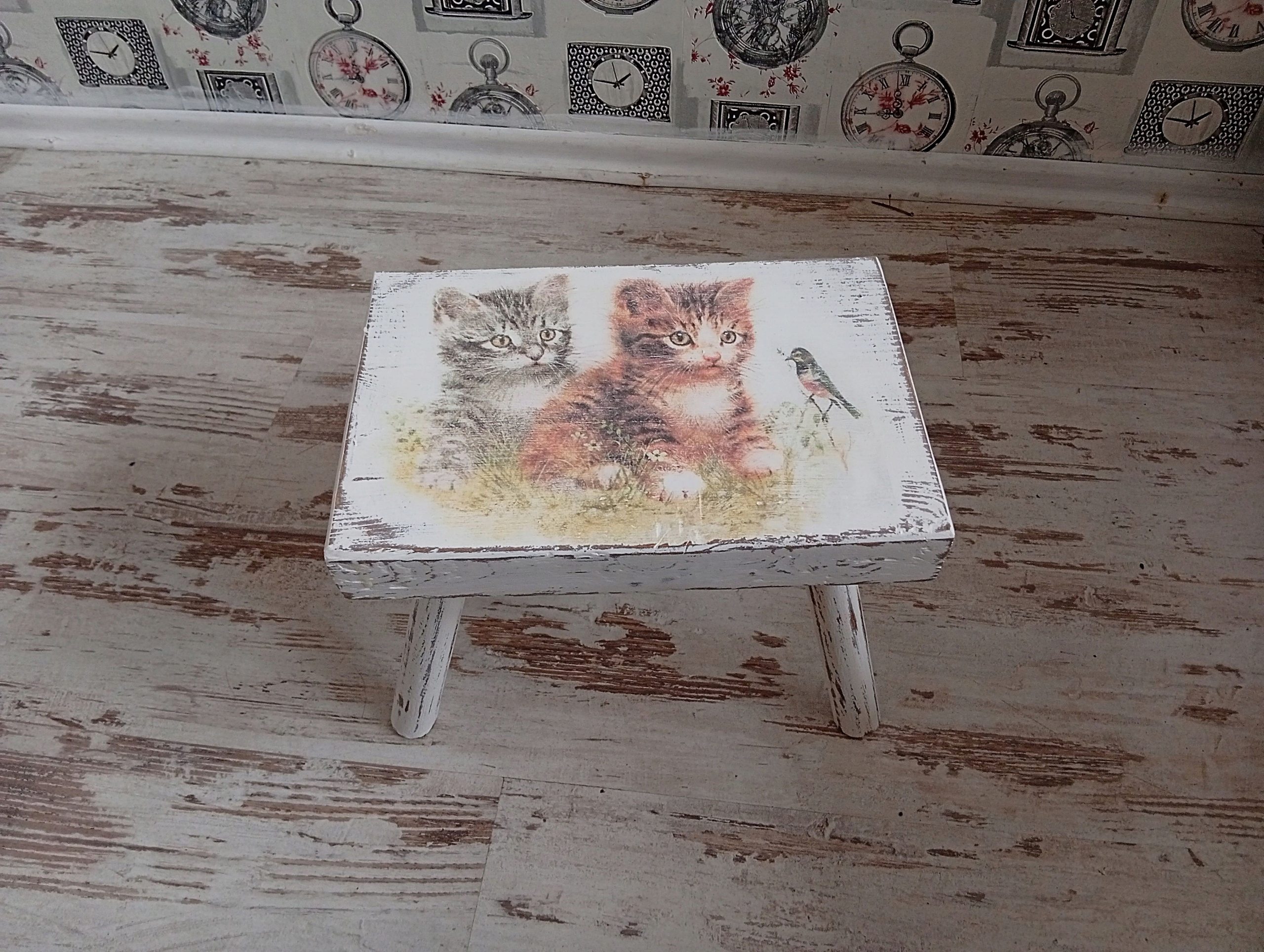 Окрашен в белый цвет, состарен, намеренно состарен, украшен вручную мотивом котенка.
