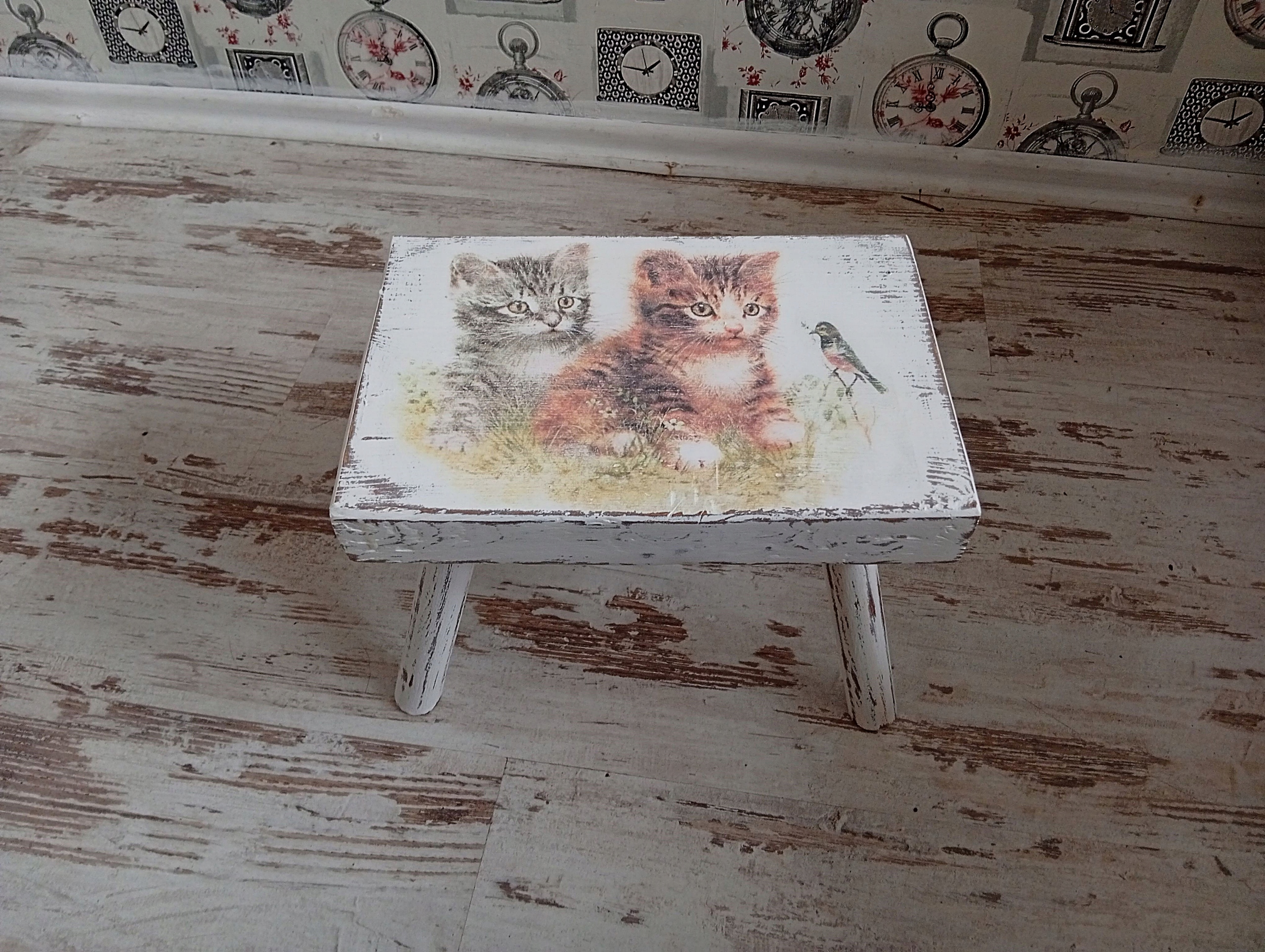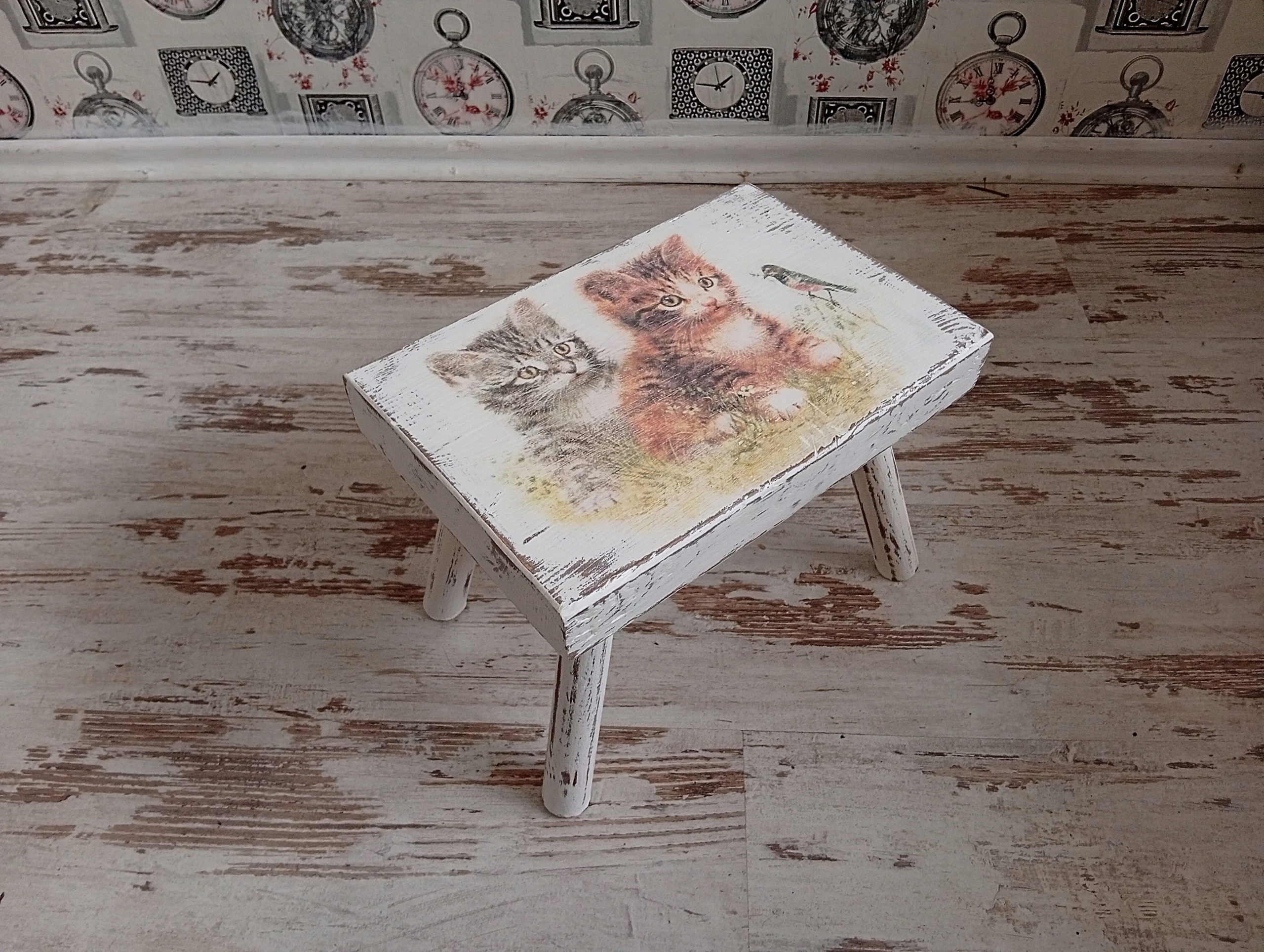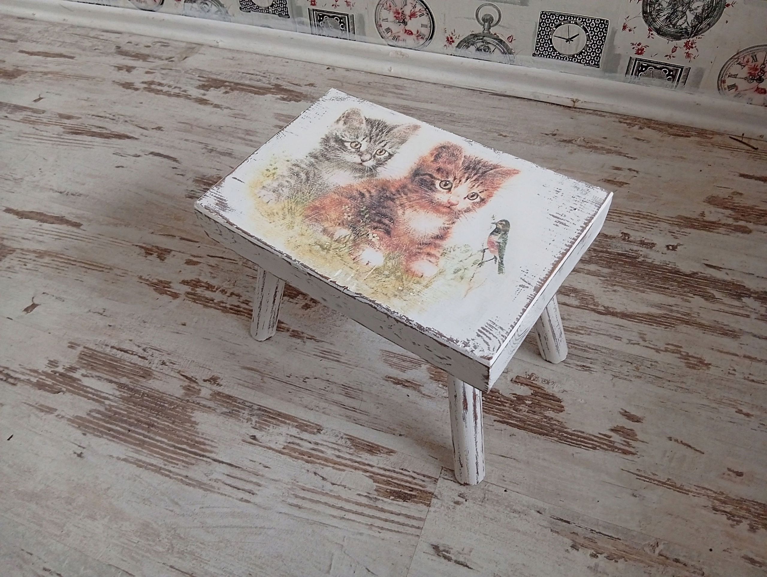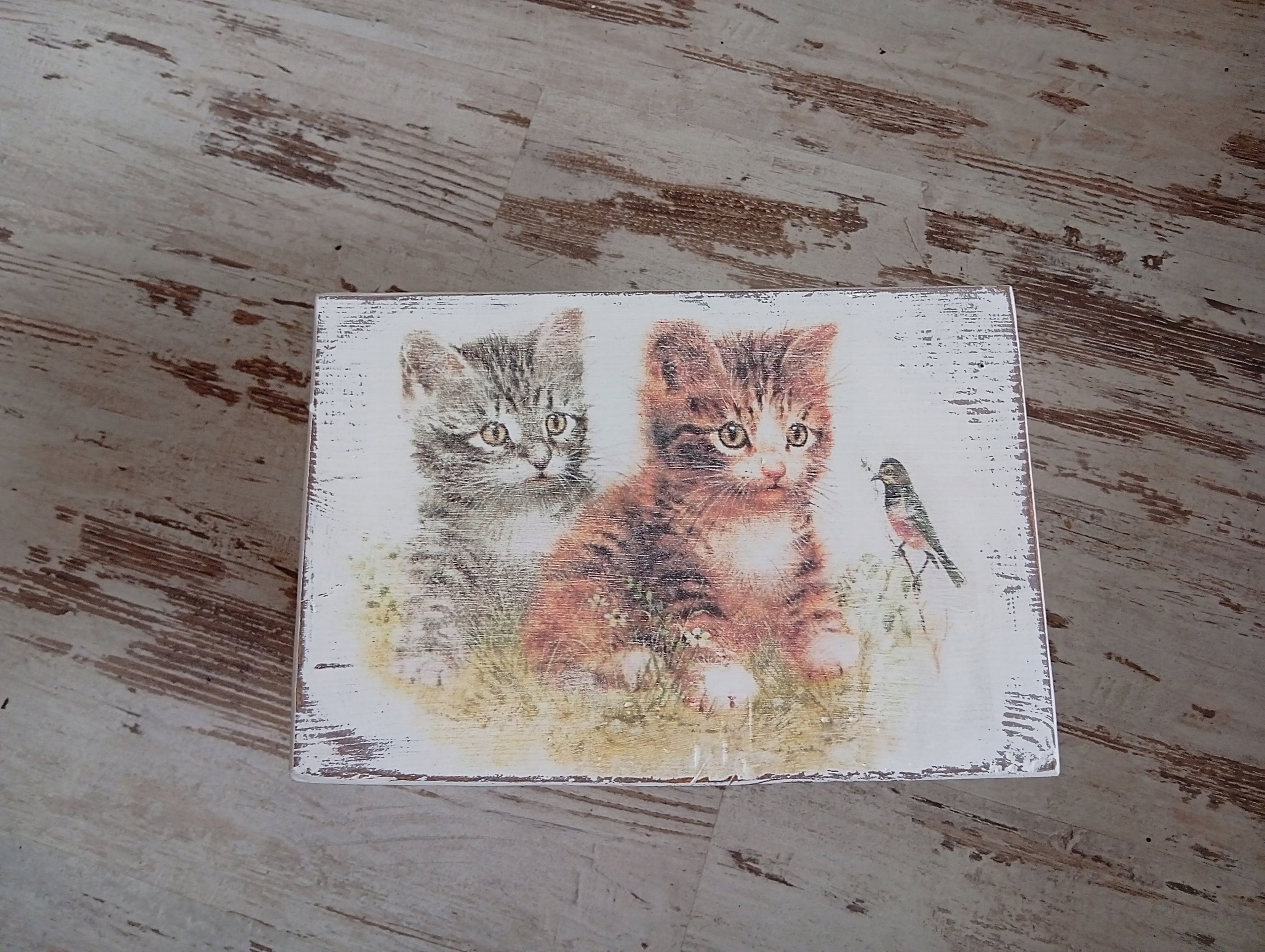 Окрашен в белый цвет, состарен, намеренно состарен, украшен вручную мотивом котенка.