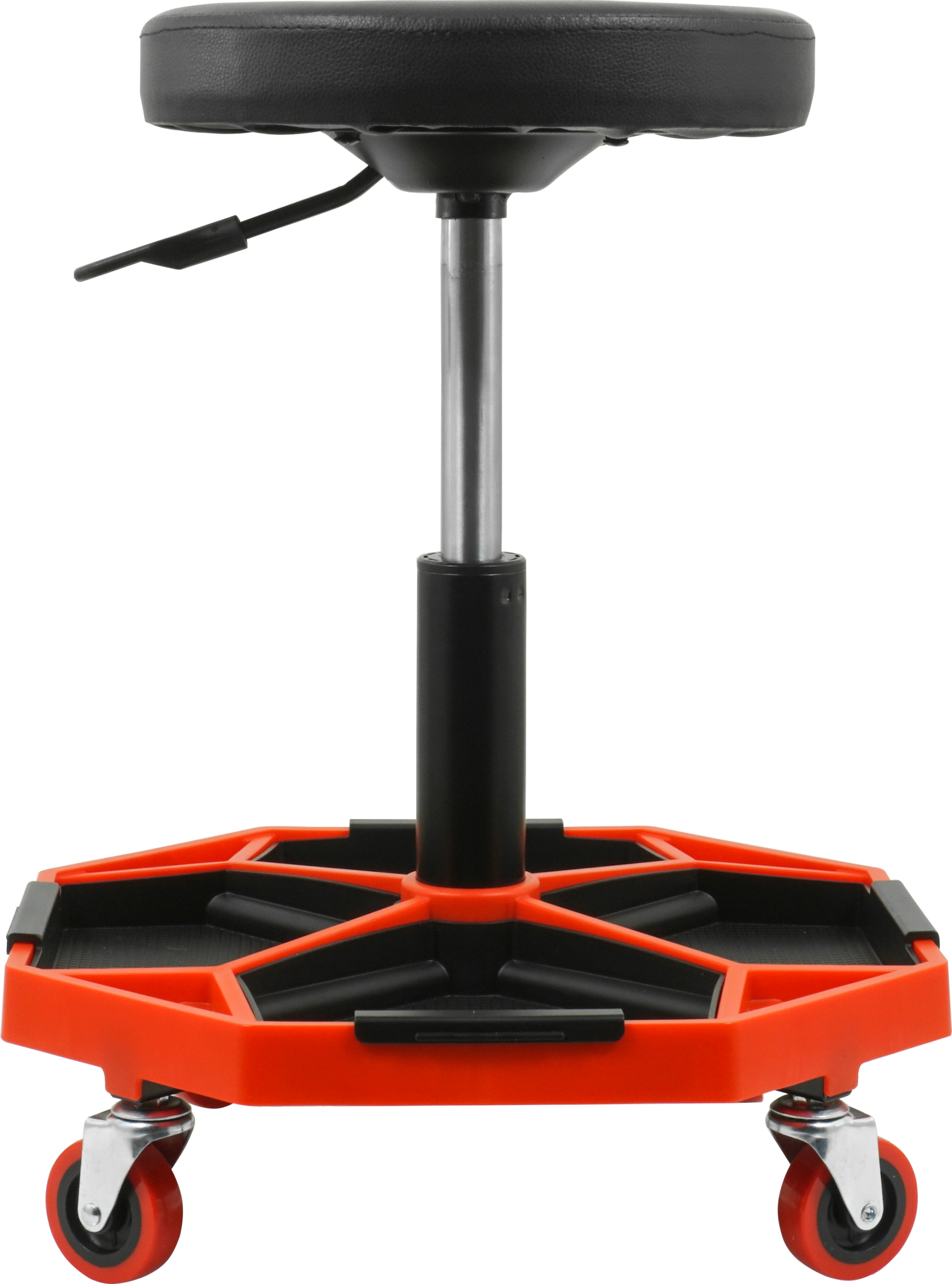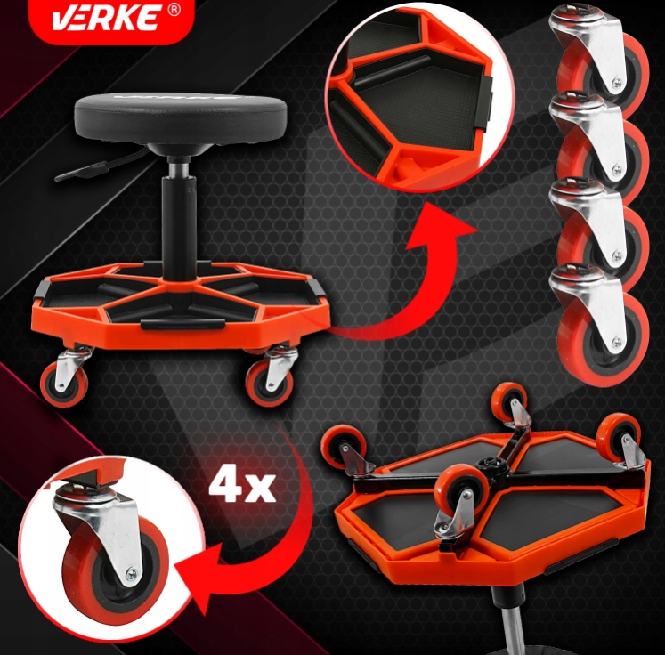 Табурет для мастерской Verke предназначен для использования в профессиональных мастерских, автосервисах, ремонтных заводах, а также отлично подойдет для домашнего гаража. Он имеет поворотное сиденье и 4 поворотных колеса, которые повышают его мобильность. Практичное решение – оборудовать его большой полкой, на которой механик сможет разместить инструменты, используемые во время работы. Покрытие удобного сиденья выполнено из ПВХ. Благодаря пневматической регулировке высоты его можно легко подогнать под рост человека.
