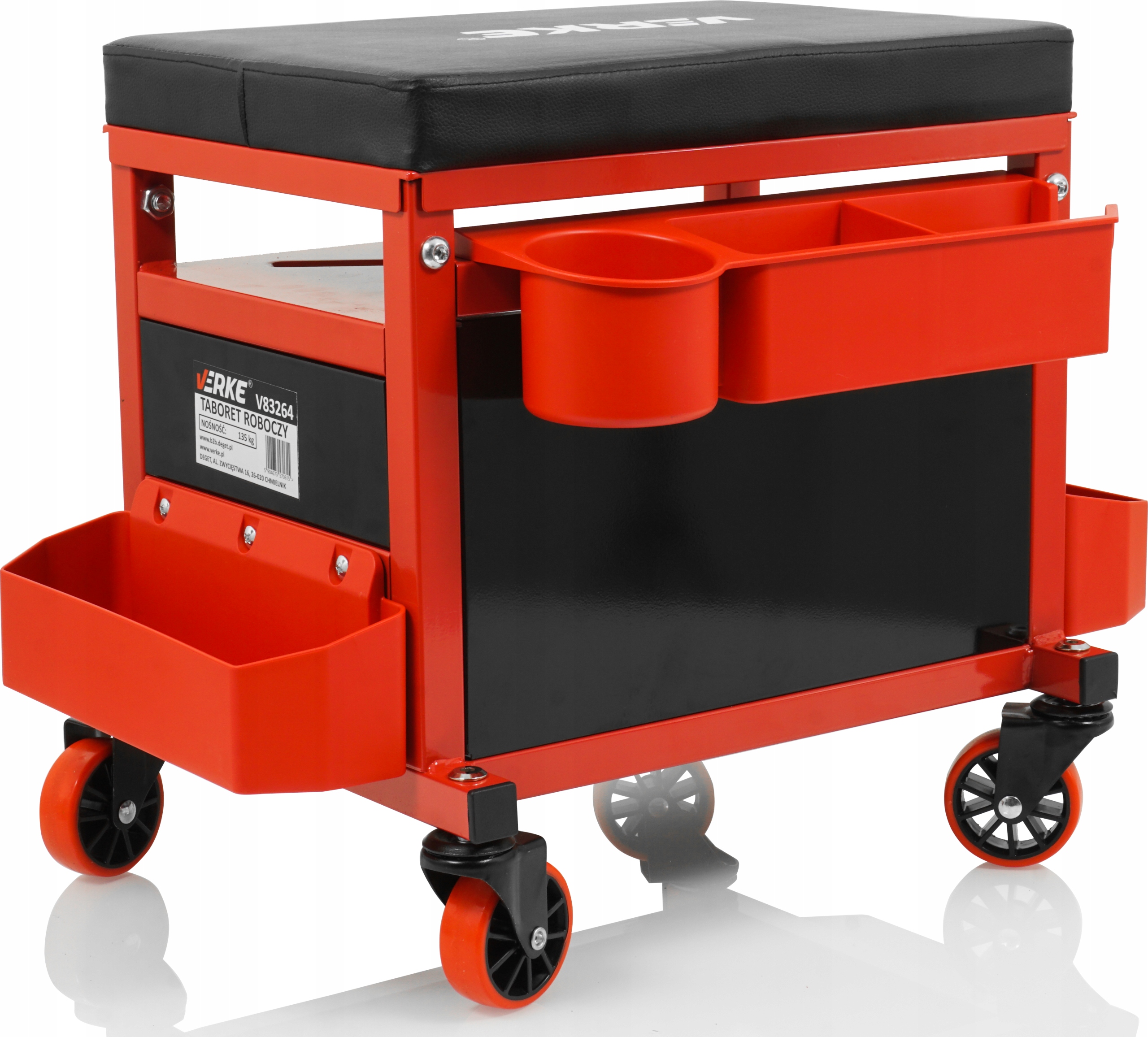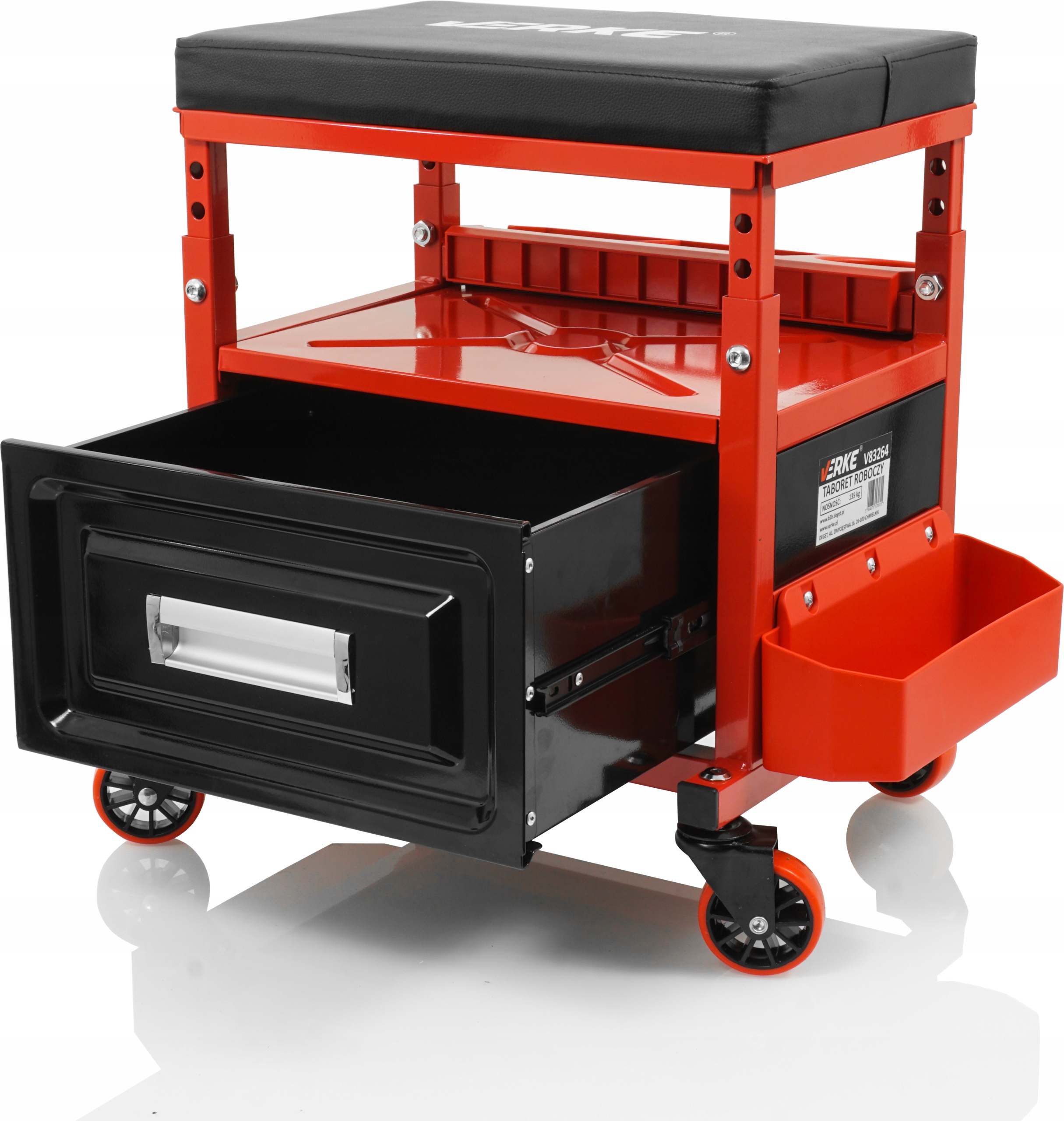 Табурет для мастерской Verke был разработан для использования в профессиональных мастерских, автосервисах, ремонтных мастерских, а также отлично подойдет для домашнего гаража. Практичное решение – оборудовать его большой полкой и 3 дополнительными полками, на которых механик сможет разместить инструменты, используемые во время работы. Покрытие удобного сиденья выполнено из ПВХ. Благодаря 4-ступенчатой регулировке высоты сиденья его можно легко настроить под рост человека.