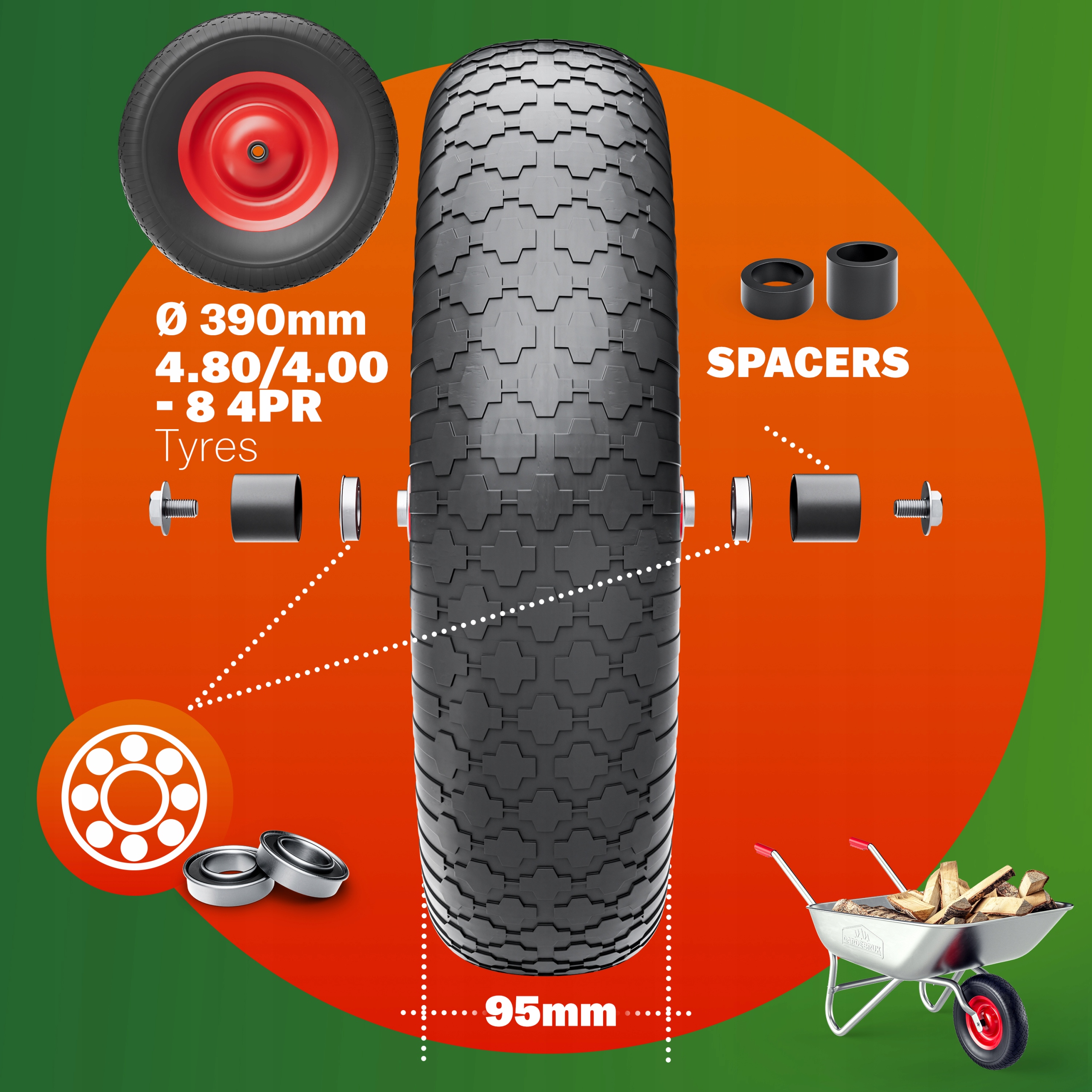 С пневматическим колесом с прочным стальным ободом и шарикоподшипниками, облегчающими транспортировку по неровным поверхностям.
