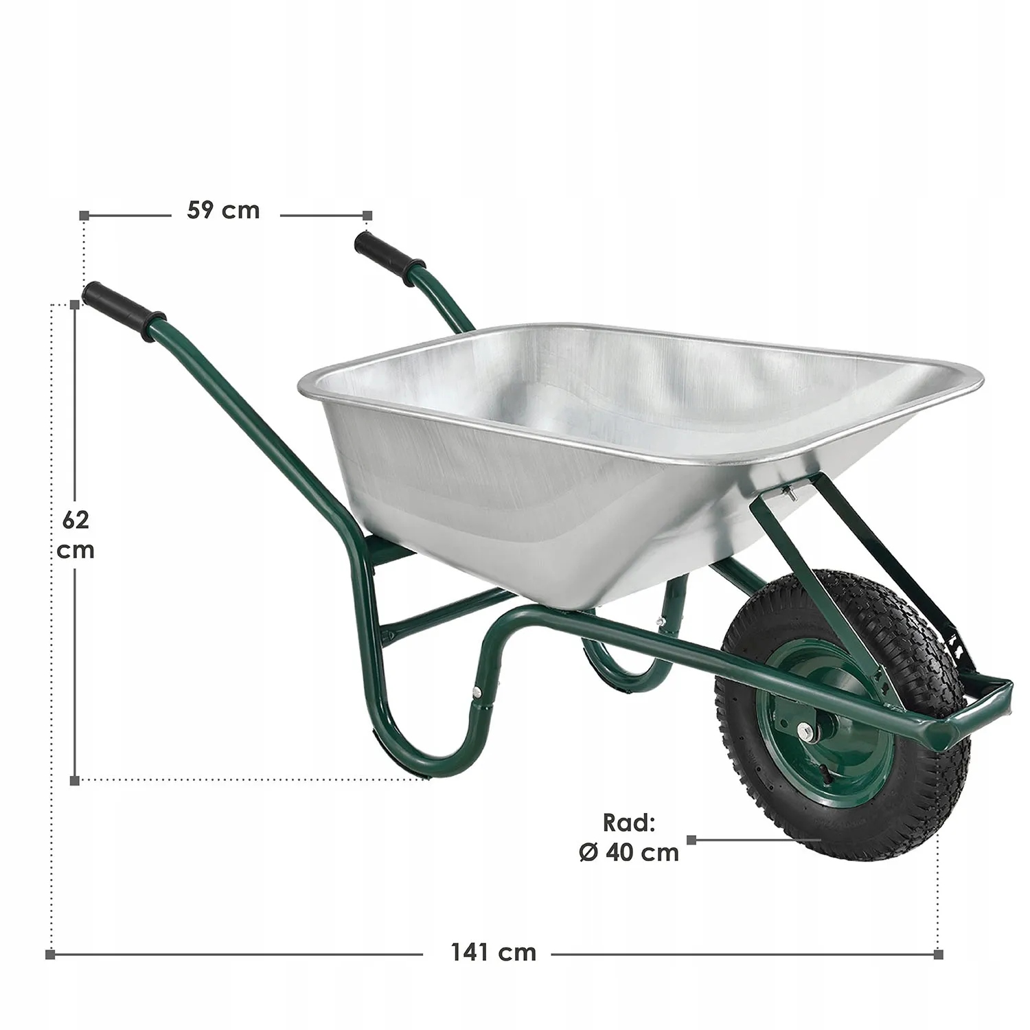 Универсальная Садовая тачка с оцинкованной ванной и надувными колесами – незаменимый помощник при транспортировке. Он идеально подходит для удобной транспортировки сыпучих материалов в саду, сарае или на строительной площадке. Благодаря ванне объемом 100 литров в ней достаточно места для всех видов сыпучих материалов.