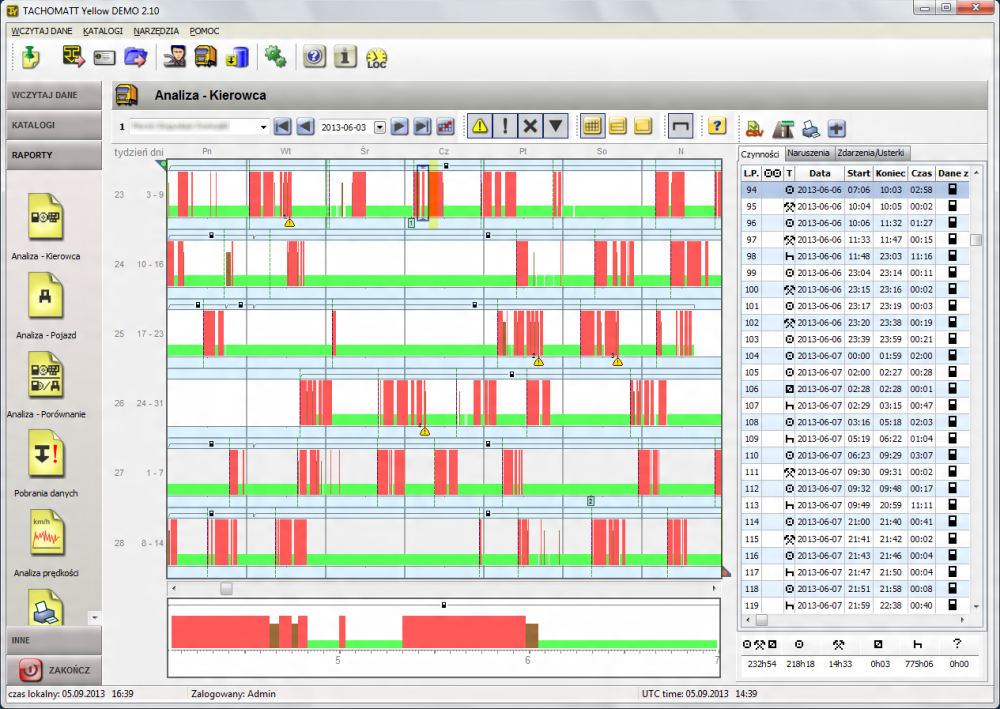 - Графический и табличный анализ деятельности водителей и данные цифровых тахографов (подробные графические диаграммы всех видов деятельности).< /ли>