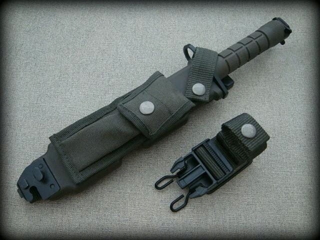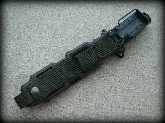 Клинок толстый (5 мм) и цельный, с вогнутым срезом. Плечо широкое, по краю имеется пила. Специальное ушко на лезвии позволяет использовать его, как и штыки LWP и WP, для резки проволоки. Прочные ножны из ударопрочного пластика с металлическим наконечником. Дополнительно имеется удобный чехол для мелких вещей. Нож фиксируется от потери (хотя это, наверное, невозможно) зажимом. Контрактная версия этого штыка все еще находится в разработке. .Высокое качество работы.