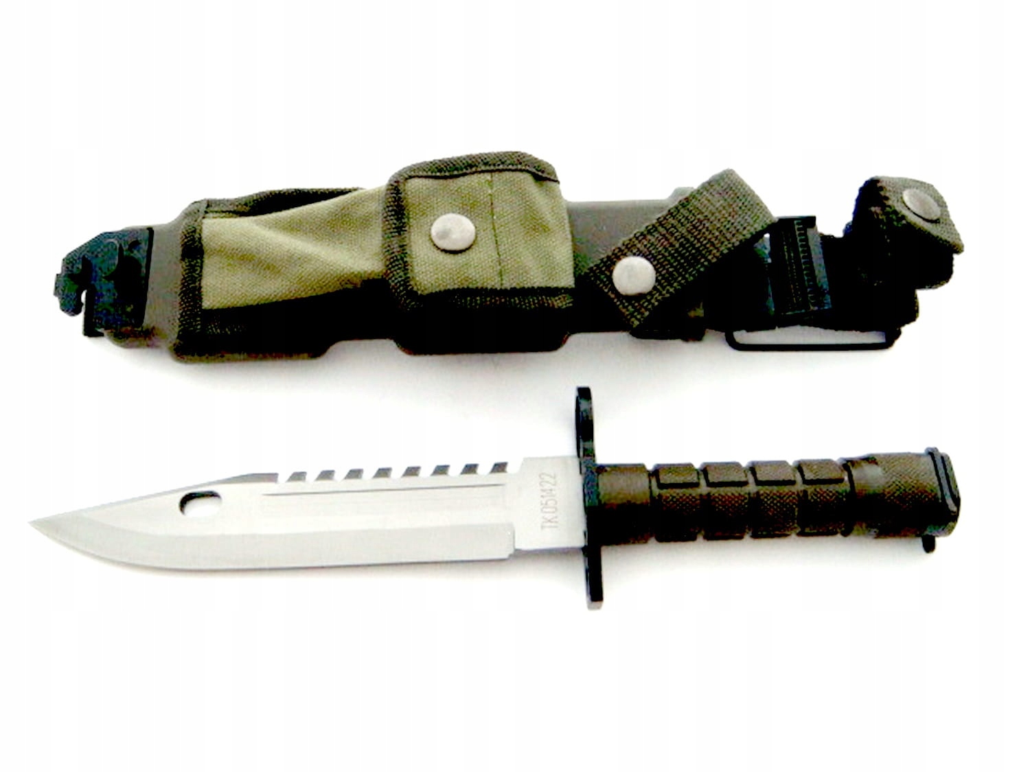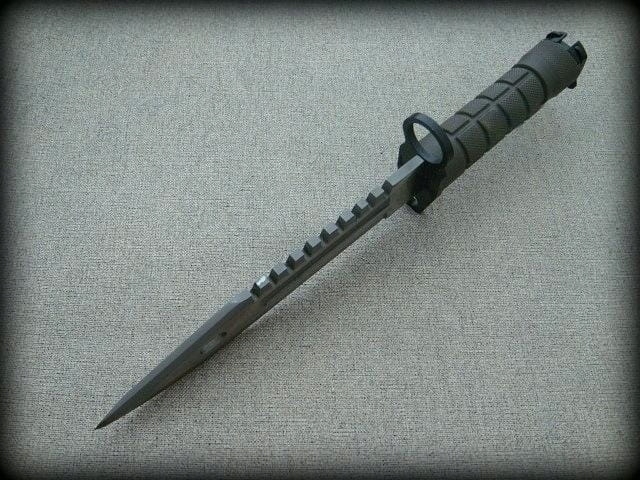 Мощный штык армии США. Нож тяжелый и массивный. Лезвие изготовлено из стали 440С, верхняя часть имеет насечки, что позволяет резать/распиливать древесину. Окорка и т.п. Ручка металлическая, покрытая прочным пластиком оливкового цвета. На рукоятке имеется механизм, позволяющий прикрепить к оружию штык. В комплект входят многофункциональные ножны. Нож идеально подойдет для использования как в туристических и спасательных экспедициях, так и при реконструкции техники американской армии.