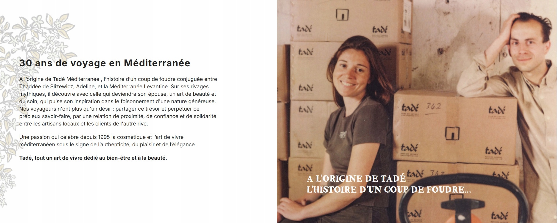 tadé méditerranée в его начале - это история любви с первого взгляда между Таде -де Слизвичз, Аделин и Левантинской частью Средиземного моря. На этих мифических банках, вместе с женщиной, которая стала его женой, он обнаружил искусство красоты, заботы и заботы, которая черпает вдохновение в изобилии щедрой природы и традиций. Наши путешественники имеют только одно желание - поделиться этим сокровищем и консолировать эти ценные знания через отношения, основанные на близости, доверительном плане и солидарности между местными мастерами и клиентами на другой стороне