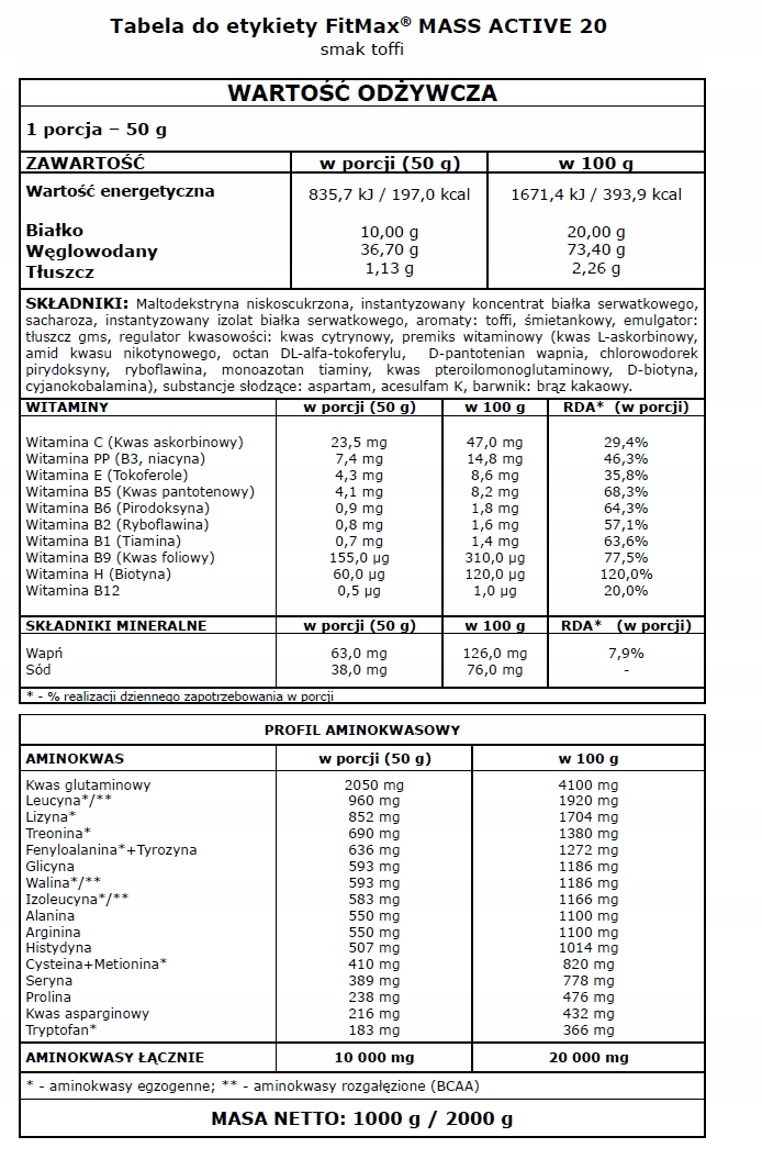 Примечание: добавка для увеличения мышечной массы FitMax® MASS ACTIVE 20 содержит сахар, подсластители и источник фенилаланина. Закатно-желтый может отрицательно влиять на активность и внимание детей.