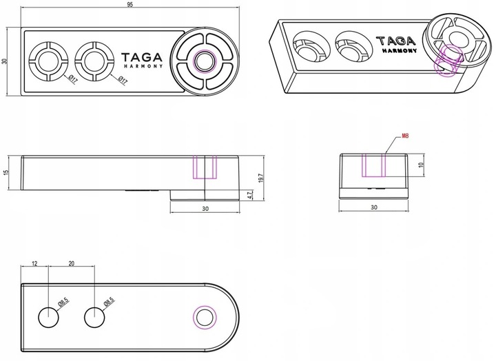 - Требования к установке: два гнезда с резьбой M8 / минимальная глубина гнезда 25 мм.