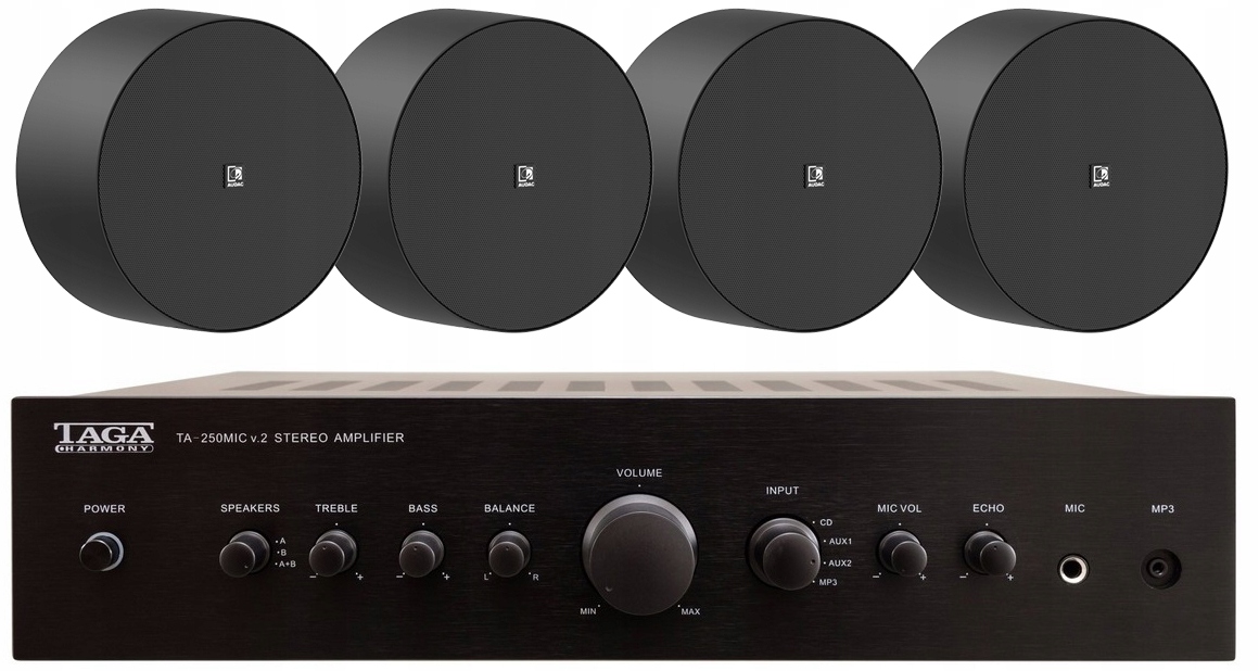 TAGA Harmony Wzmacniacz instalacyjny domowe hi-fi + Głośnik sufitowy Audac NELO706/B czarny