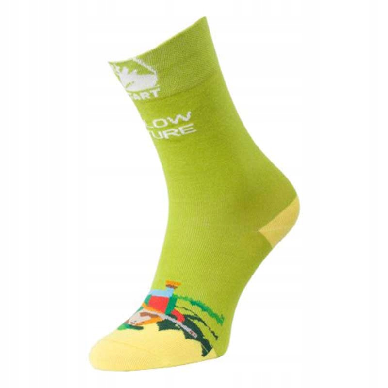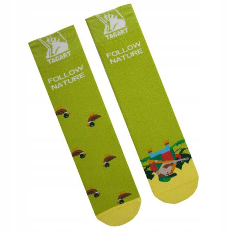 Летние носки с охотничьими мотивами. Светло -зеленый цвет. Пальцы и каблук в желтом. Различная графика справа и левого носка, изображая охотника на утиную охоту