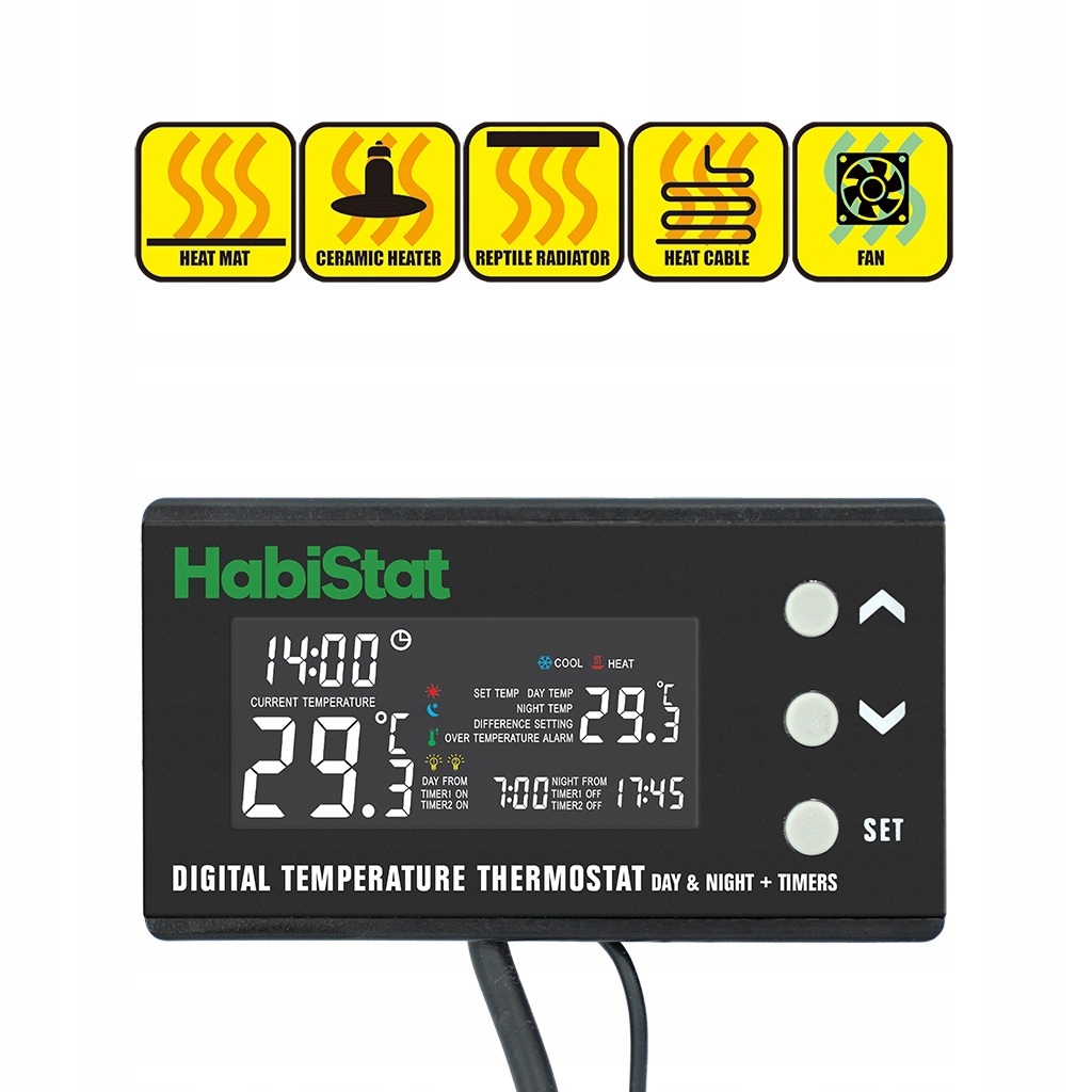 Цифровой контроллер Habistat предназначен для контроля параметров освещения и нагрева в режиме ночи/дня, облегчает контроль с высокой точностью условий в террариуме, высвобождая владельцев от страха перед их превышением. отопление приятеля. В случае мата мы рекомендуем близко к сборке датчика по причинам более безопасного контроля температуры - возможности сжигания животного с неточной сборкой или использованием высококачественных нагревательных ковриков Reptech со встроенным температурным предохранителем <50C