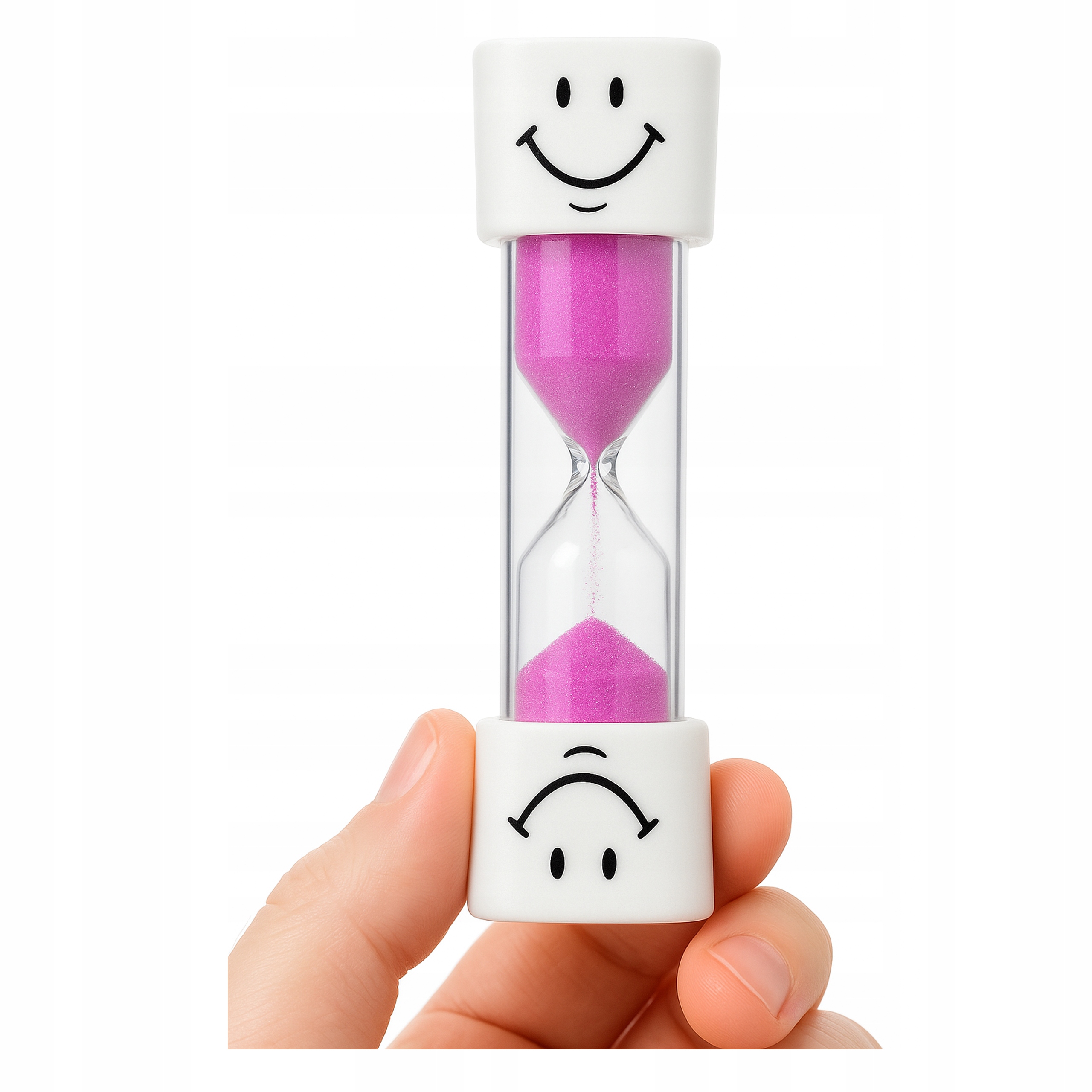 У песочных часов белый зуб с веселыми улыбающимися лицами с обеих сторон. Он наполнен цветным песком, заливка занимает около 3 минут, чего вполне достаточно для идеально чистых зубов и здоровой, сияющей улыбки.