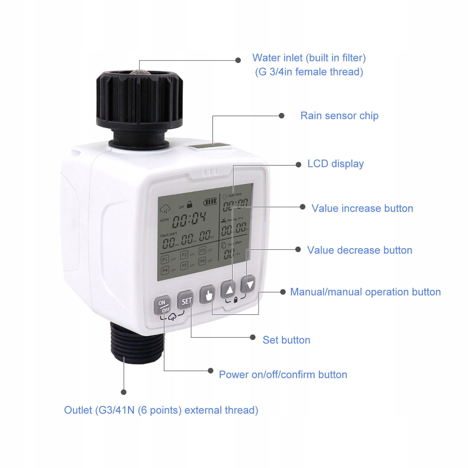 1. [Особенности] Таймер разбрызгивателя имеет 6 независимых программ, фильтрацию воды на входе, автоматический сон, напоминание о включении, двойной ручной режим, водонепроницаемость IPX5 и другие функции.