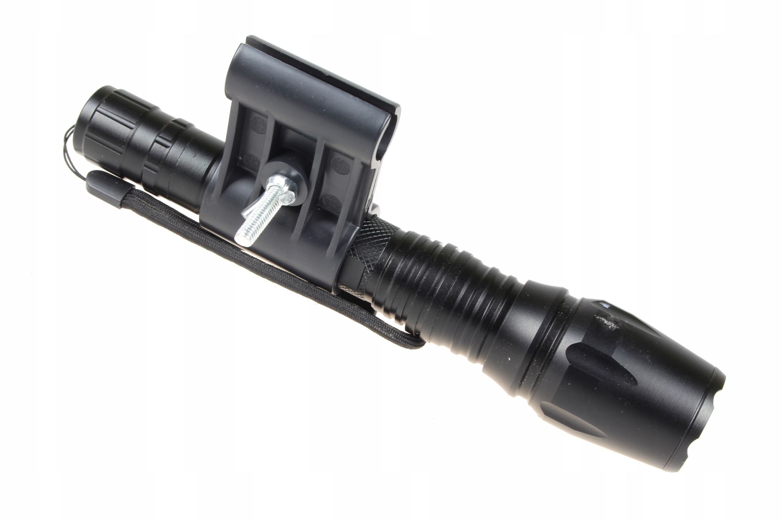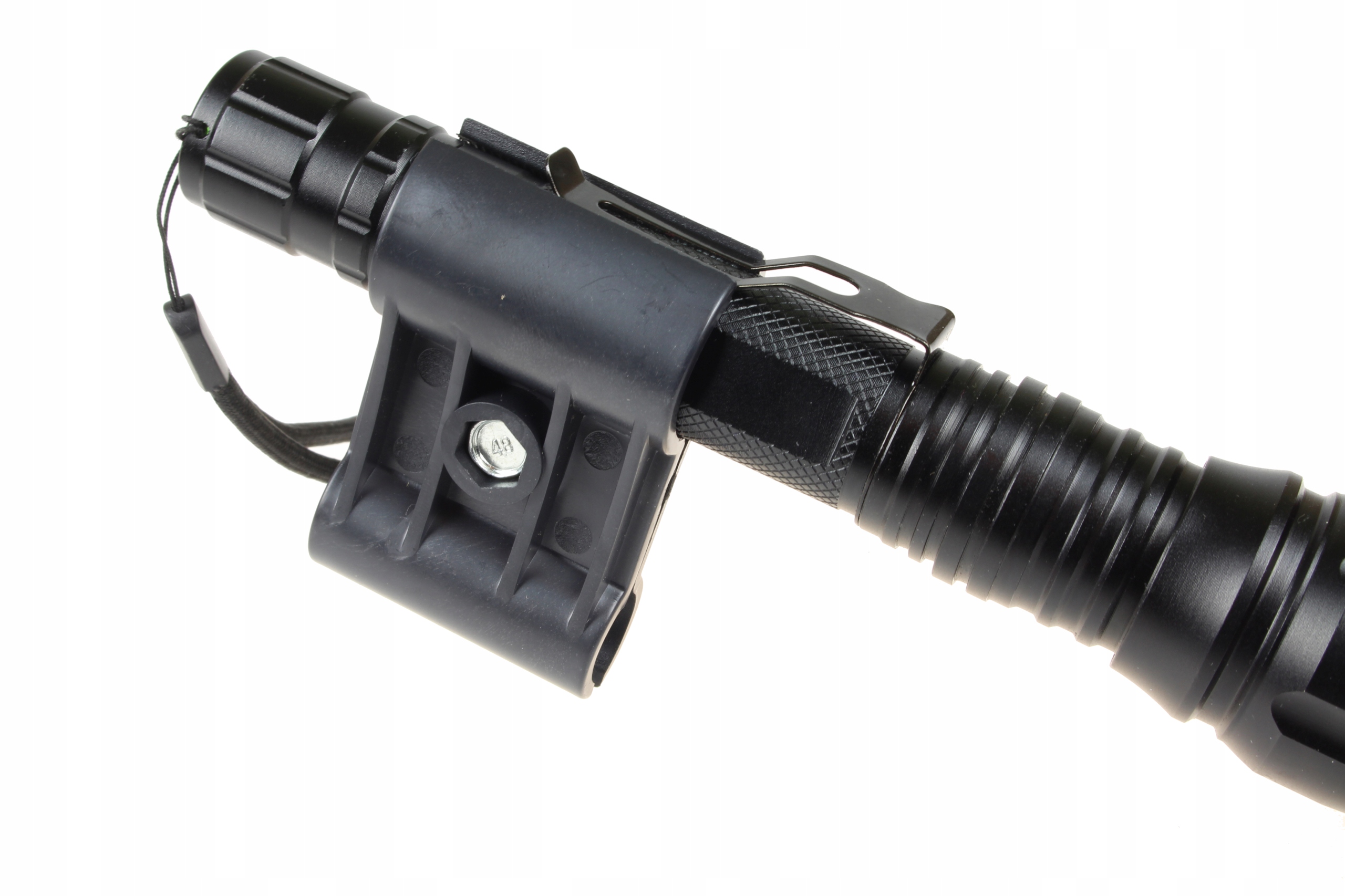 Держатель позволяет закрепить фонарь на стволе оружия или под ним.