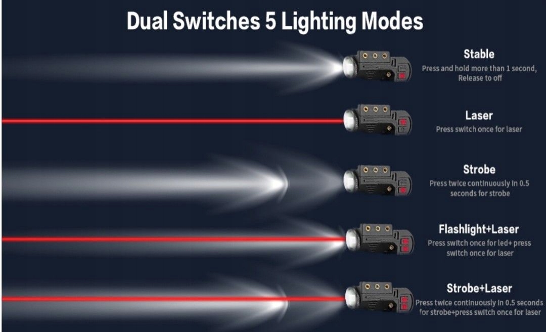 ◇ Подкрастья, сплошные переключатели включены/выключены с помощью светодиодного стробоскопического режима. Независимо от того, используете ли вы левую или правую руку, пистолетный лазерный прицел может быть удобно эксплуатироваться. Включение обеих комбинаций лазерного света может работать до 90 минут или меньше, только лазер - 8 часов ORSO, только фонарик - 2 часа.