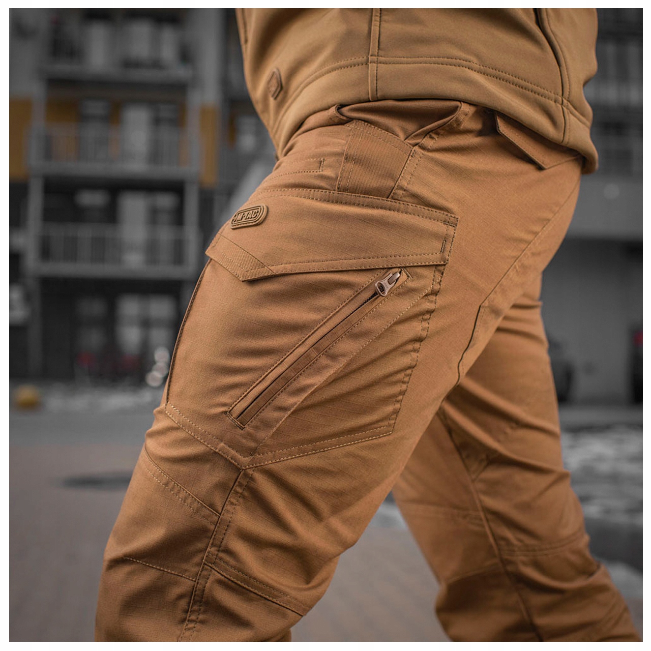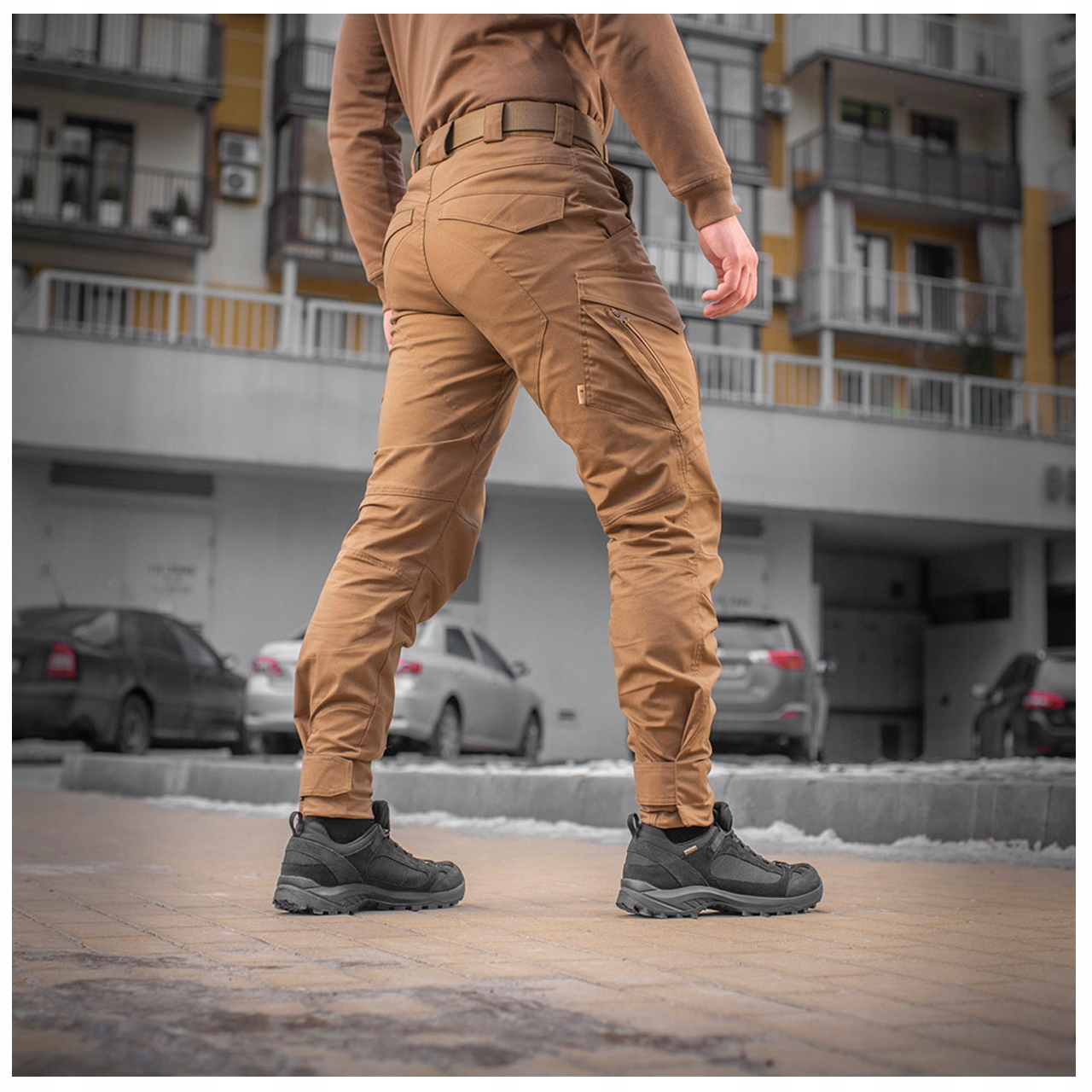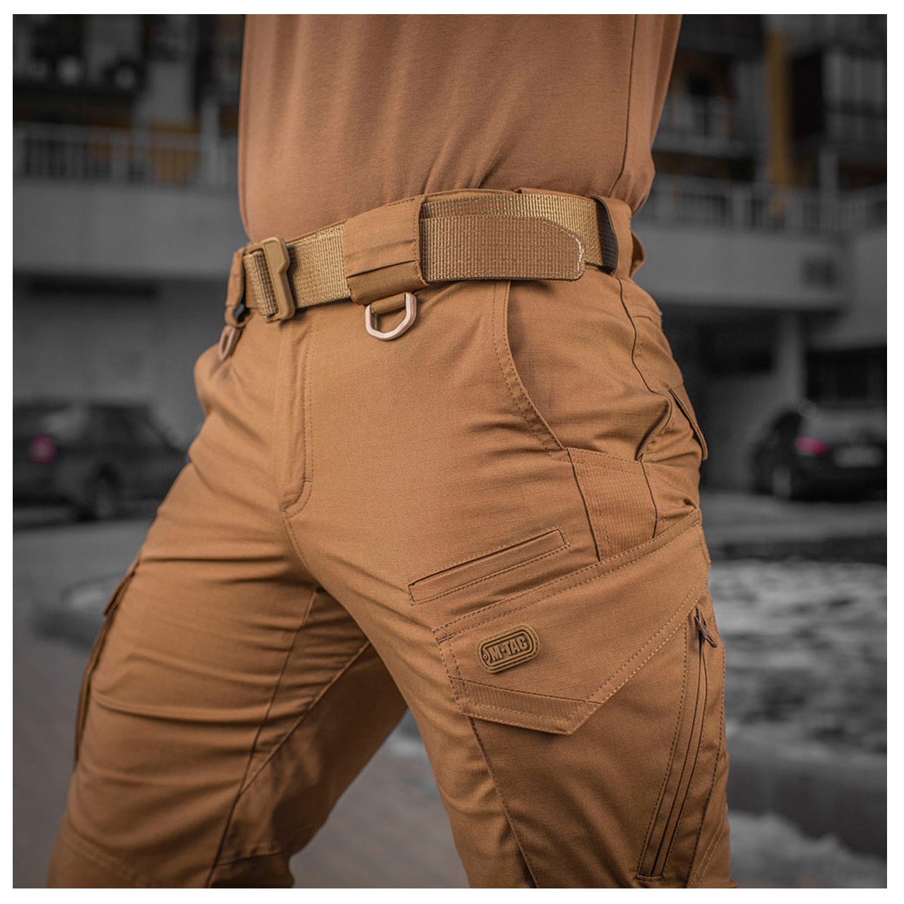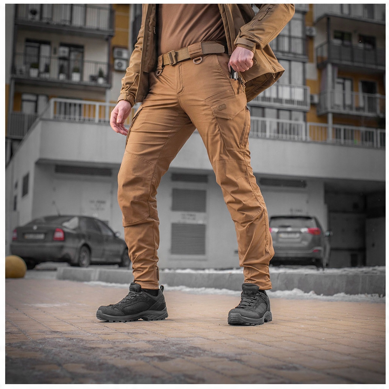 ВНИМАНИЕ! Предметом предложения являются брюки Aggressor Gen.II Flex Coyot. Другие элементы (например, нож, телефон, обувь, перчатки, толстовка, ремень и куртка) используются для визуализации функциональности.