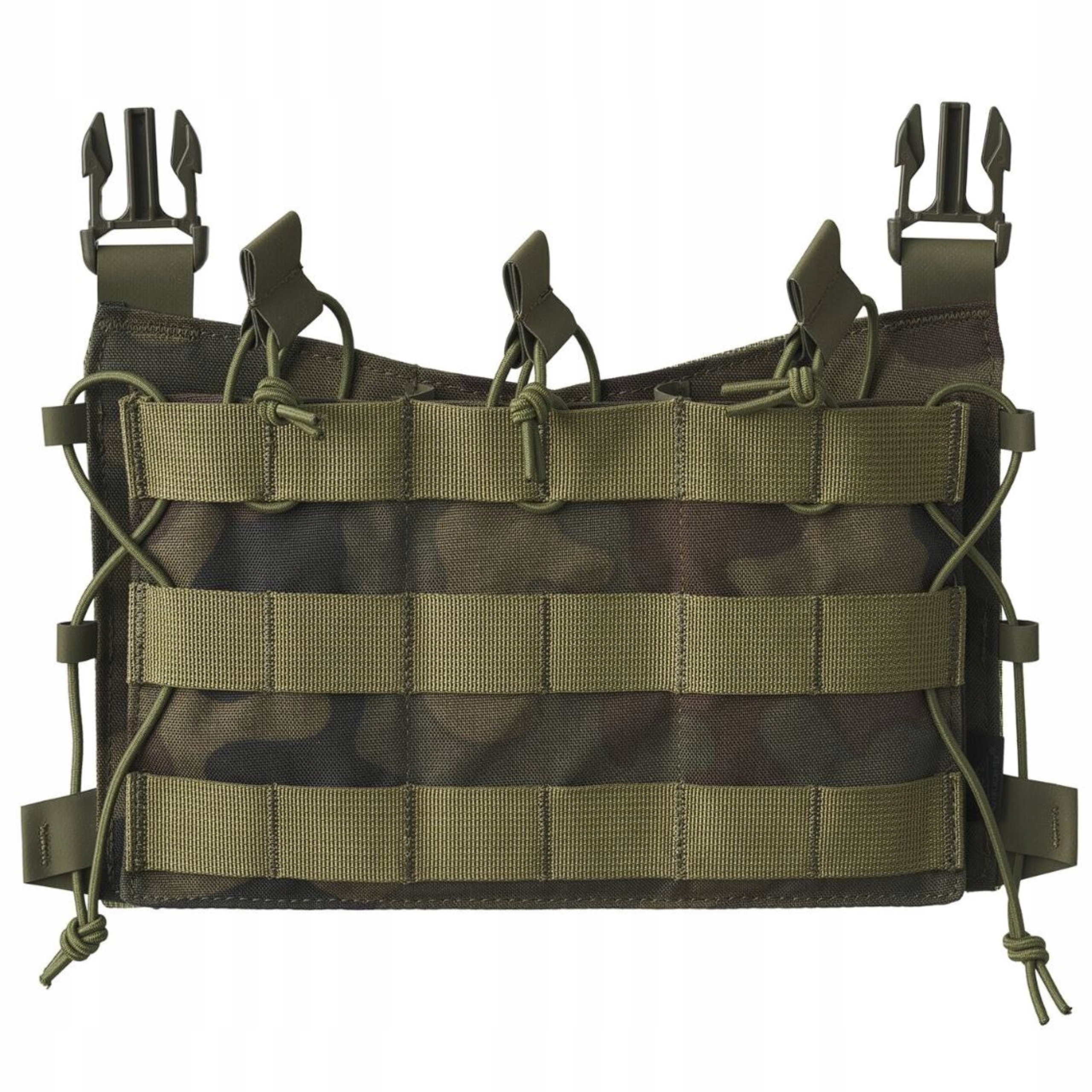 Нижняя часть передней панели оснащена модулем с универсальным подсумком Guardian Flap для трех магазинов винтовки АК/АР >. Подсумок полностью изготовлен из Cordura® 500D. Кабель Shock-Cord с эргономичной ручкой из ламината предотвращает случайное выскальзывание магазина, обеспечивая при этом легкий доступ к нему.