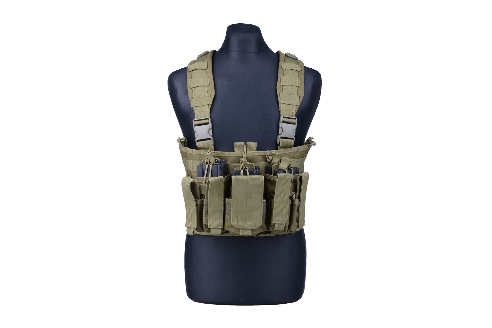 Жилет популярного кроя Chest Rig, выполненный из прочного и легкого нейлона. Изделие оснащено тремя двойными подсумками, вмещающими в общей сложности 6 магазинов стандарта М4 или АК. Дополнительно в каждом подсумке имеется по два подсумка, оснащенных отрывными клапанами для пистолетных магазинов.