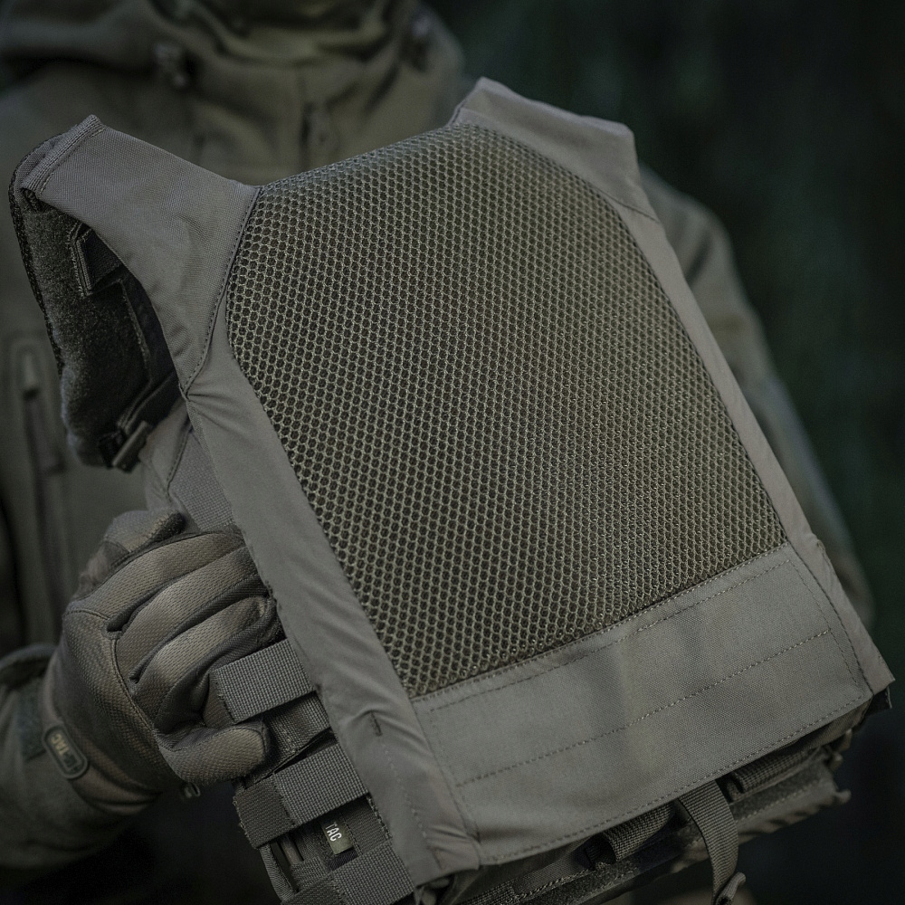 Оснащен передней и задней панелями для баллистических вставок, совместимых со стандартными системными пластинами SAPI и ESAPI (США) размеров S и M. Жилет также совместим с наиболее популярными формами баллистических пластин SAPI, то есть E-Cut, Swimmer Cut и Shooter Cut.