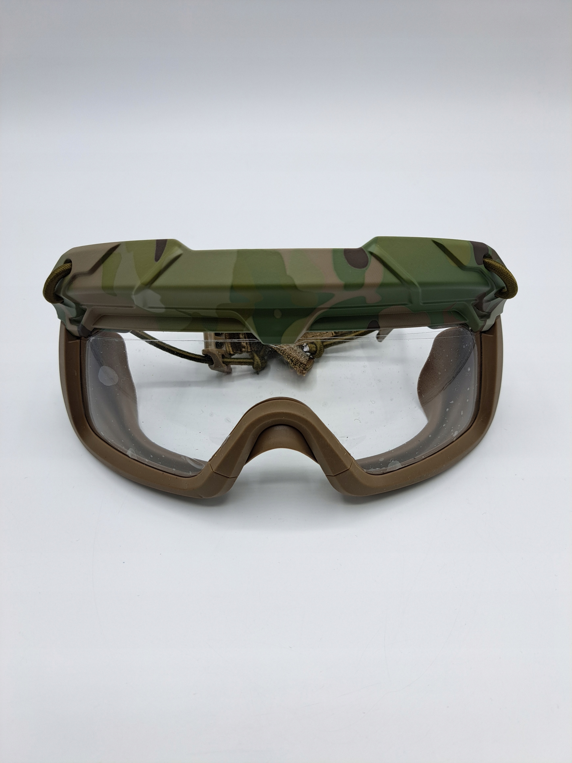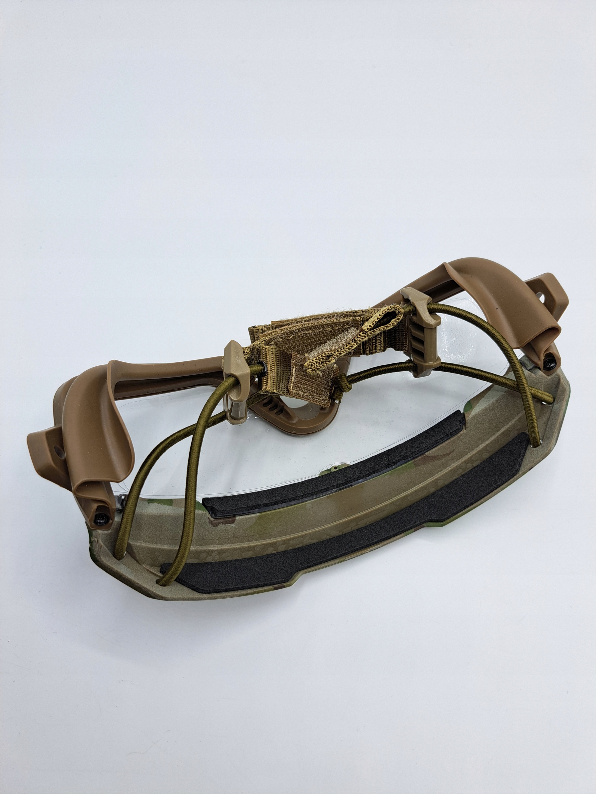 Основной корпус тактического шлема изготовлен из высококачественного технического АБС-пластика. Протестировано на ударопрочность 800FPS при температуре от -10°C до 42°C; оправа защитных очков изготовлена из термопластичного полиуретана и гибкой резины (ТПУ), а линзы – из материала ПК.