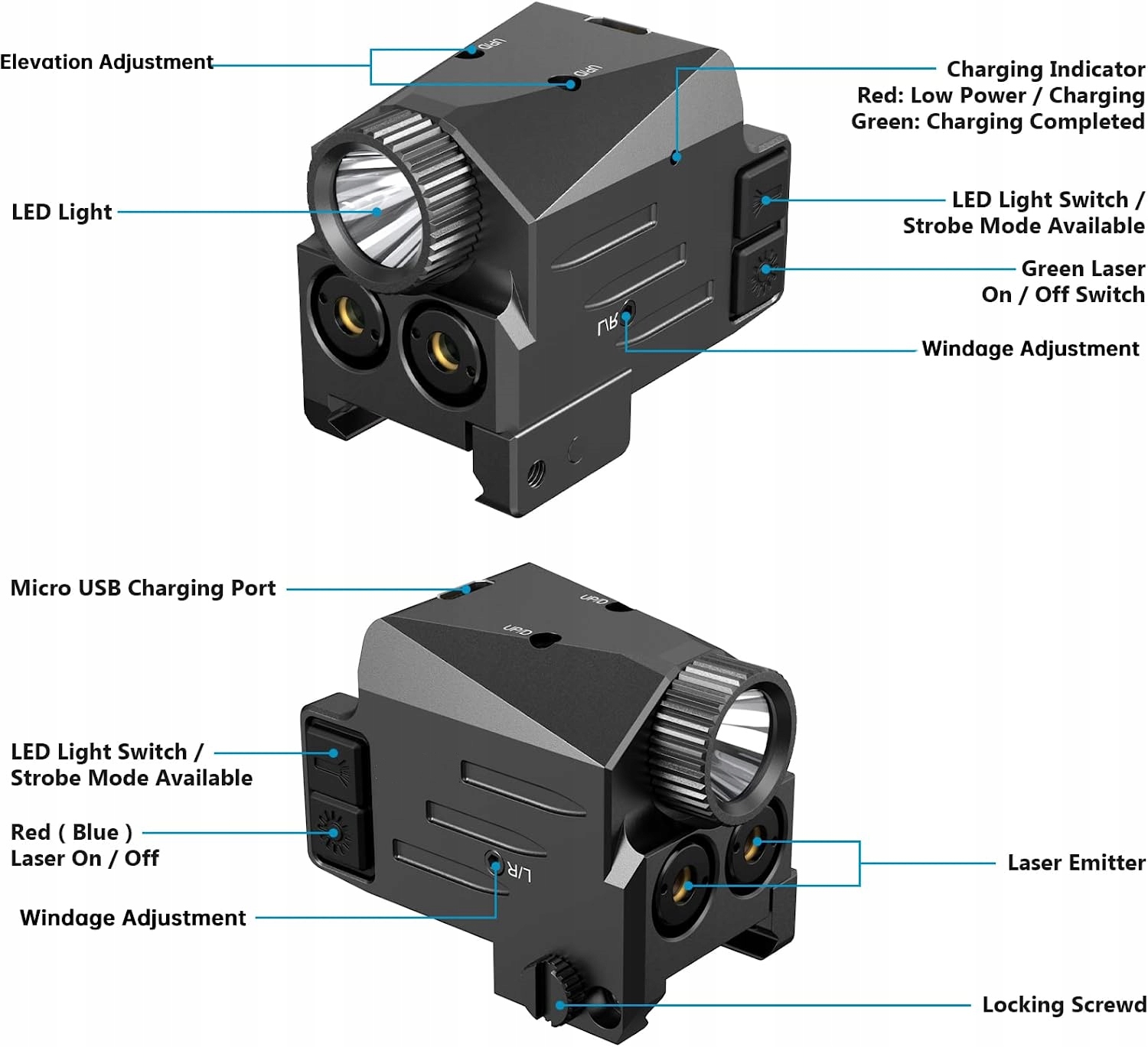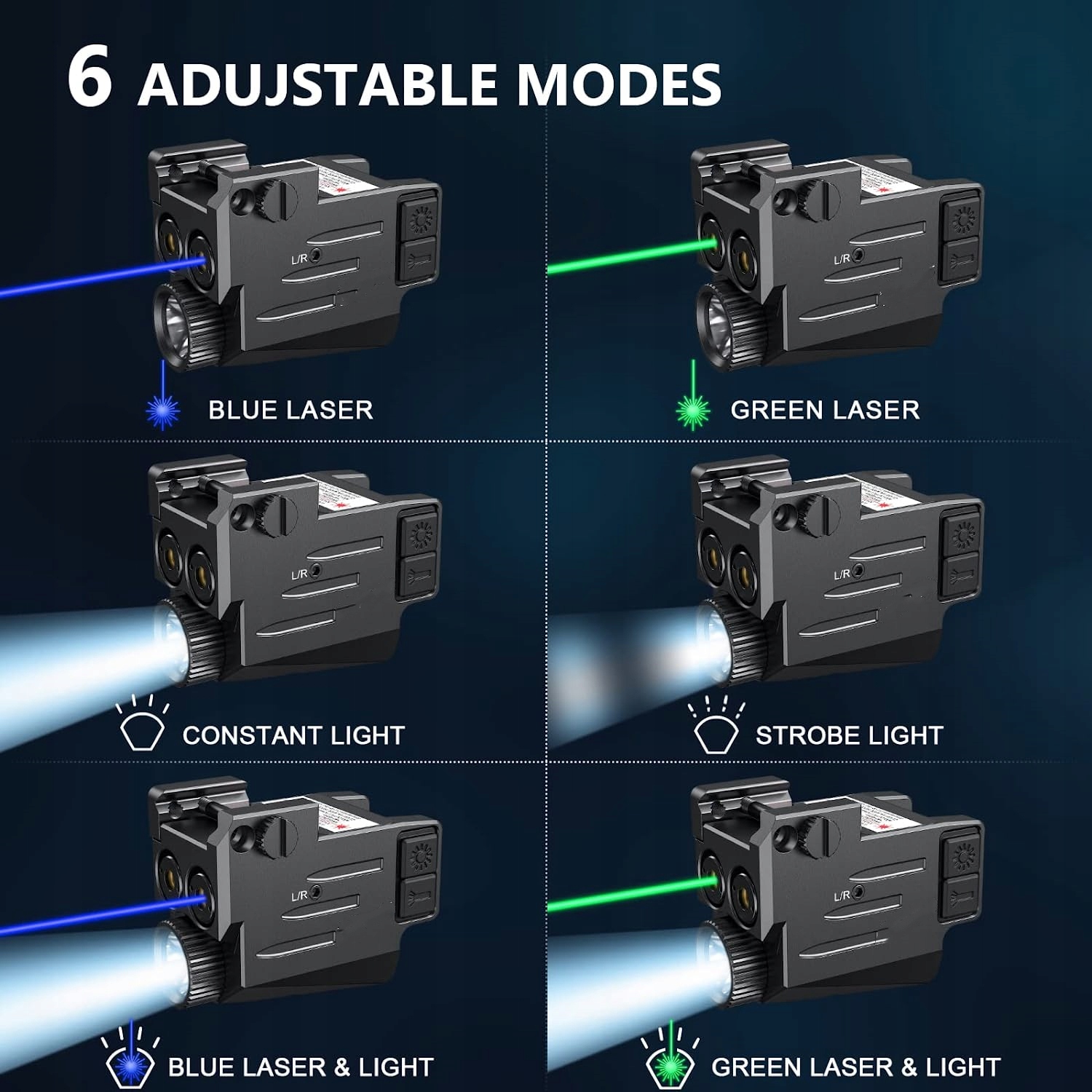【Синий-зеленый лазерный тактический фонарик】Комбинированный лазерный пистолет 2 в 1 имеет 2 регулируемых красно-зеленых лазера для удовлетворения ваших дневных или ночных потребностей. Регулировка высоты (вертикального расстояния) и регулировки горизонтального отклонения (горизонтального расстояния) повысит вашу точность и позволит быстрее попасть в цель! Класс лазера: IIIA; Мощность лазера: <5 мВт