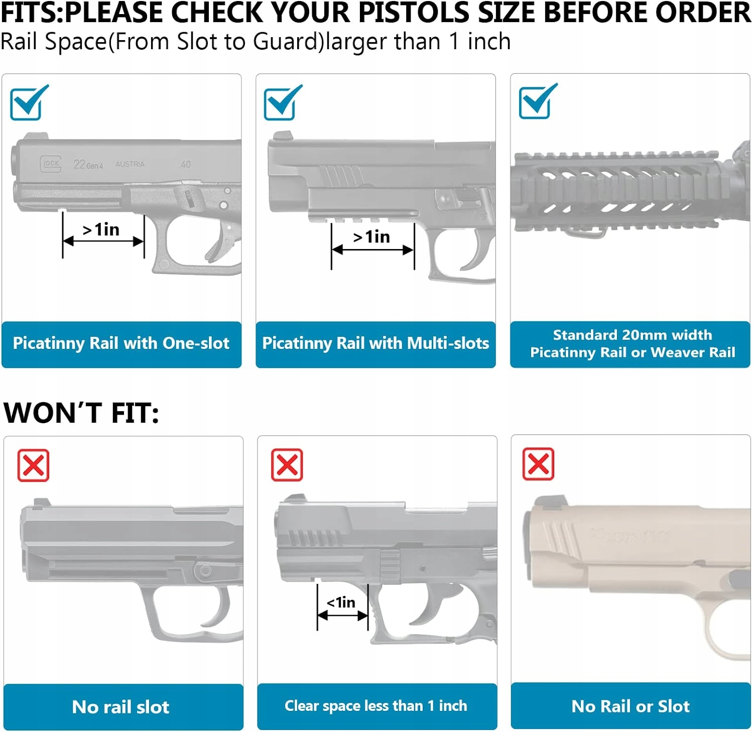 【Необходимо пространство для установки более 1 дюйма】 Гибкая комбинированная модель синего и зеленого лазерного света: (1) Пикатинни 20 мм с прорезью; (2) Расстояние для установки от паза до спусковой скобы более 1 дюйма. (3) При использовании просто вкрутите 1 винт. Упаковка: 1 фонарь-пистолет, 1 зарядный кабель, 1 руководство, 1 металлическая пластина, 1 запасной винт, 1 гаечный ключ.