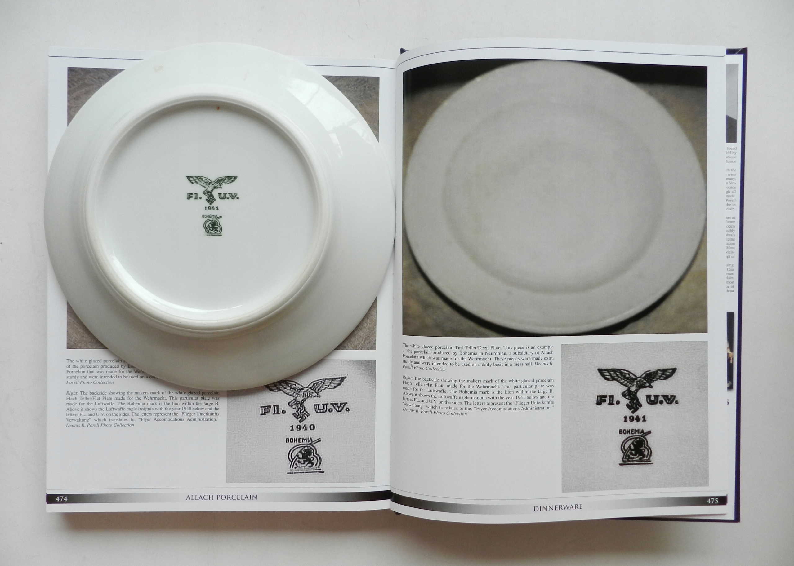 Предмет аукциона — оригинальная тарелка из столовой Люфтваффе в аэропорту Кракова. Производство SS Allach на заводе Porzellanfabrik Bohemia, Нойроглау. На последних фотографиях представлены такие тарелки в литературе по данной теме (том 2 каталога фарфора Аллаха). Состояние видно на фотографиях, никаких трещин и сколов, видимых потертостей на эмали и изменений цвета. Тарелка обеденная, плоская. Высота ок.: 3,8 см, диаметр ок.: 22,8 см. Красиво подписано, все подписи подглазурные. Конечно, 100% оригинал той эпохи, 1941 года.
