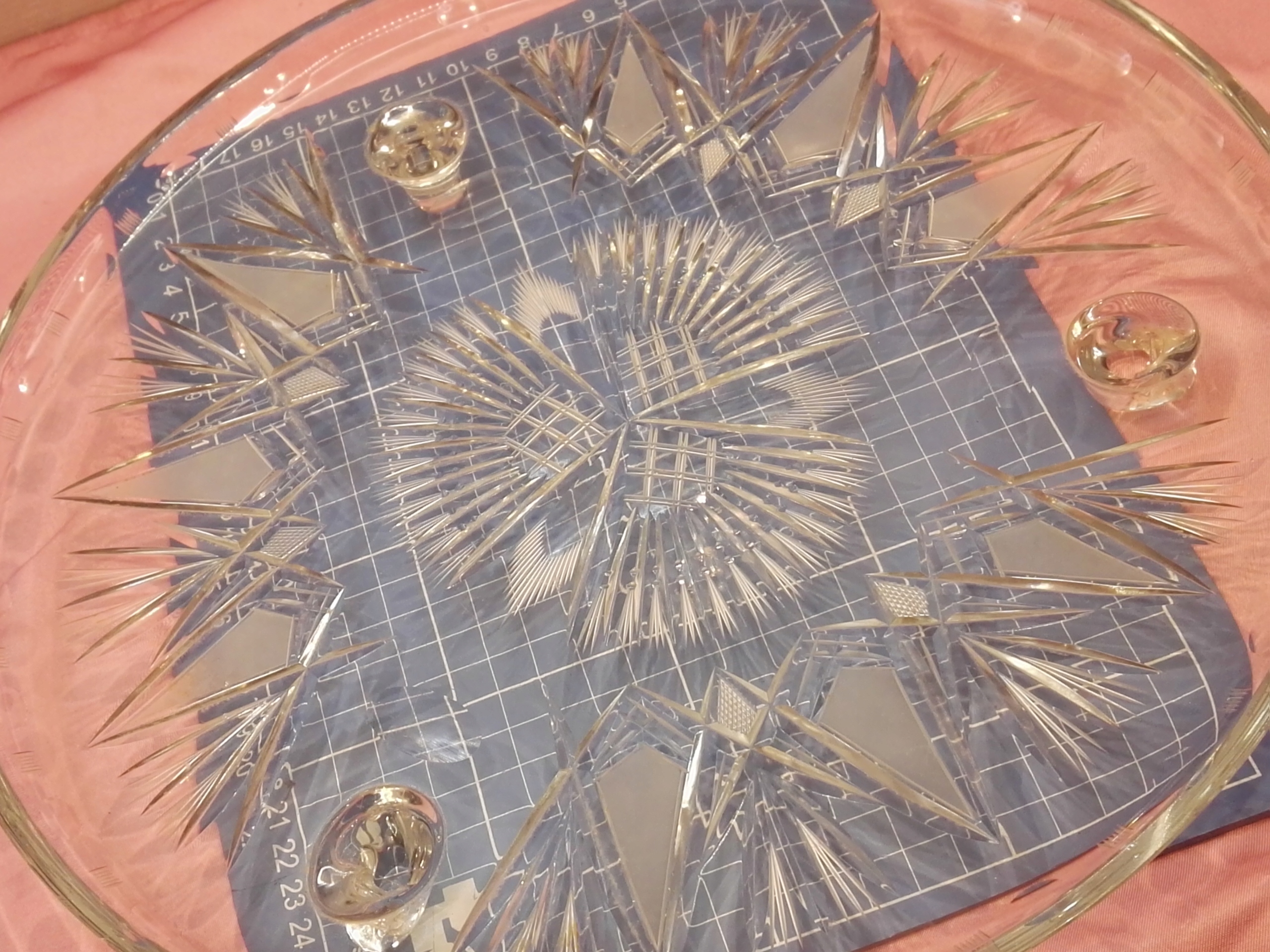 ТАрелка ТАРЕЛКА СТОЙКА ДЛЯ ТОРТА СТЕКЛО РЕЗНОЕ СТЕКЛО КРИСТАЛЛ? ГЕОМЕТРИЧЕСКИЙ ОРНАМЕНТ, 3 НОЖКИ ДИАМЕТР 31,5 см ВЫСОТА 4,2 см Б/У СОСТОЯНИЕ, КАК ПОКАЗАНО НА ФОТОГРАФИЯХ, ДВА ЗАЗИНЫ НА КРАЙЕ.