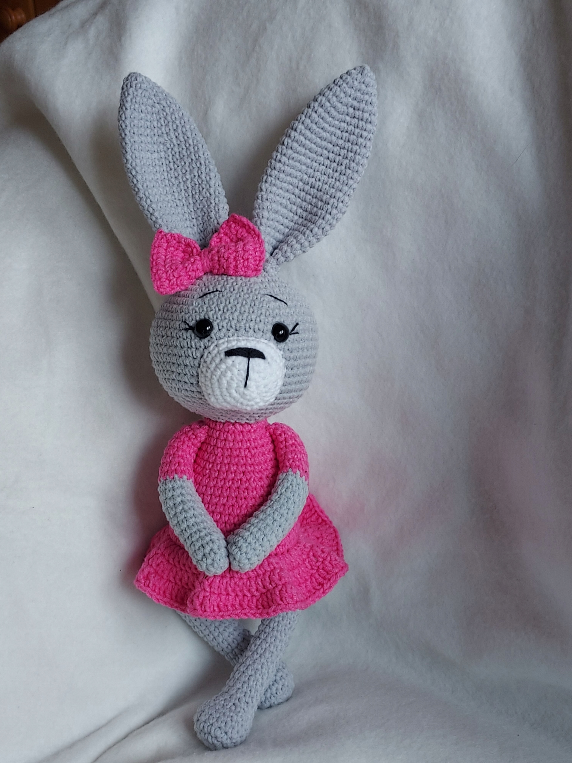 Талисман Заяц связан вручную крючком в технике амигуруми, наполнен противоаллергенным силиконовым шариком. Все выполнено из джинсовой пряжи YarnArt. Пряжа нежная и приятная на ощупь. Для безопасности ребенка глазки закреплены изнутри защелками. Серый цвет, темно-розовое платье и бант, белое лицо. Можно работать при 30 градусах, высота ок. 38 см.
