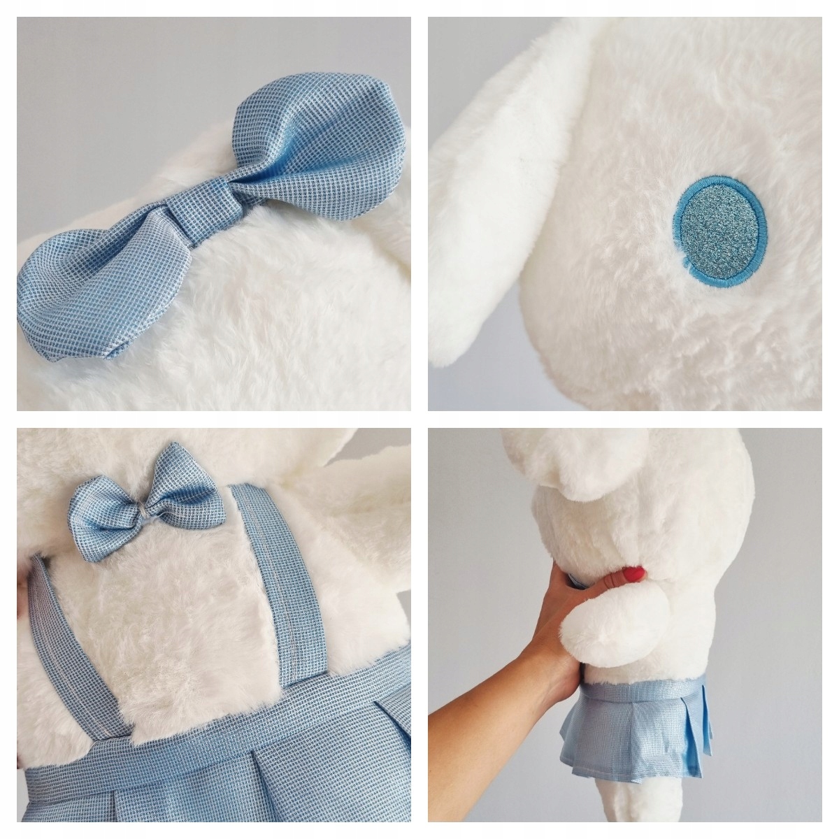 Познакомьтесь с очаровательным талисманом Cinnamoroll, в которого вы влюбитесь с первого взгляда. Это плюшевая игрушка с большими голубыми глазами и милой улыбкой. На ней слегка блестящее голубое платье, на голове бантик, сочетающийся с остальным нарядом.