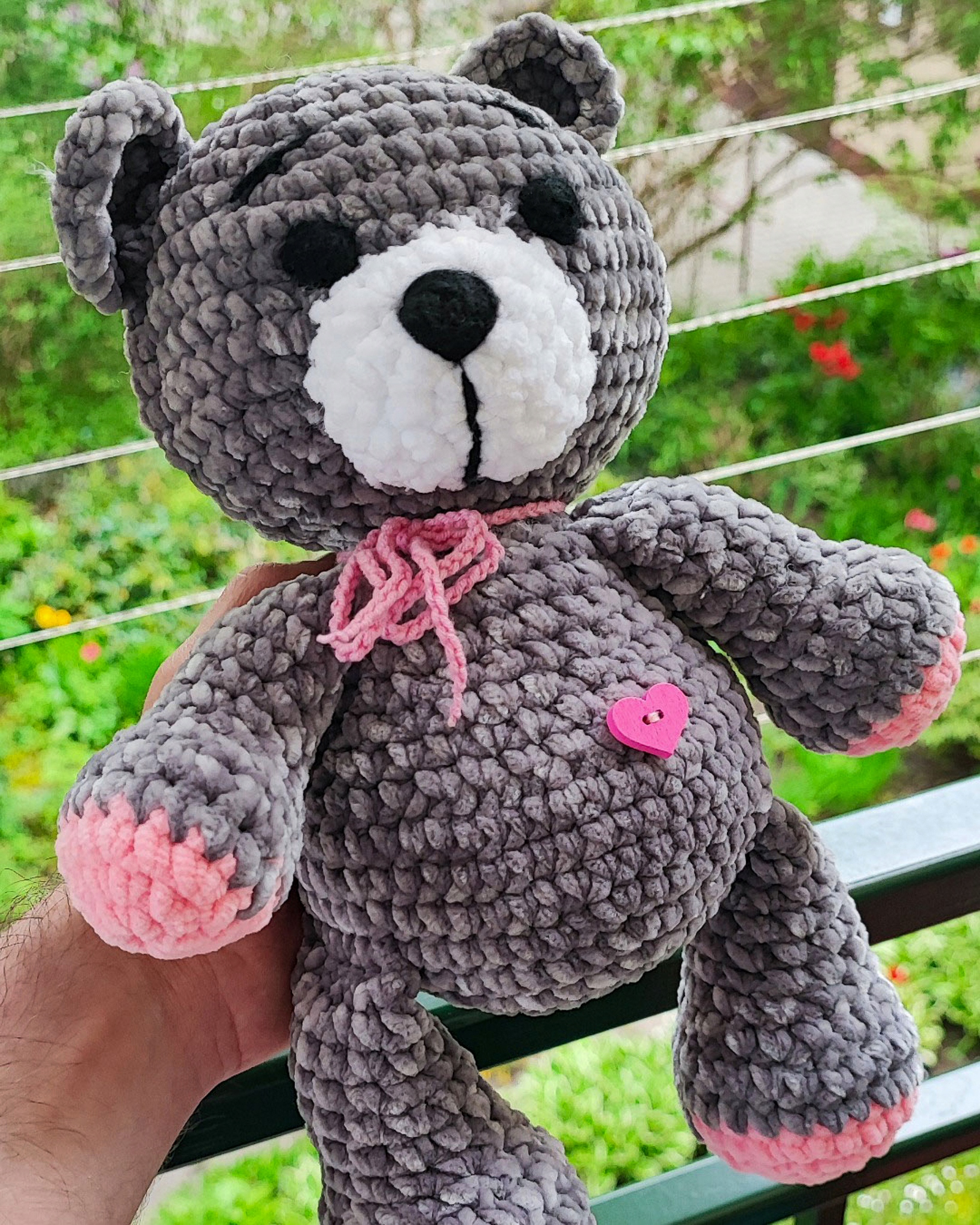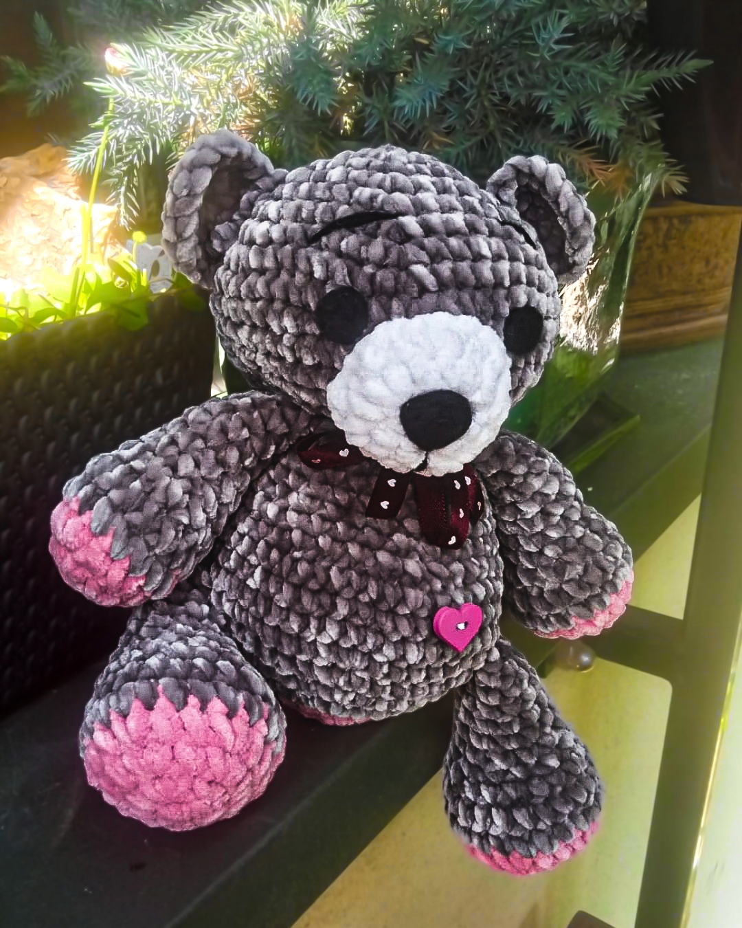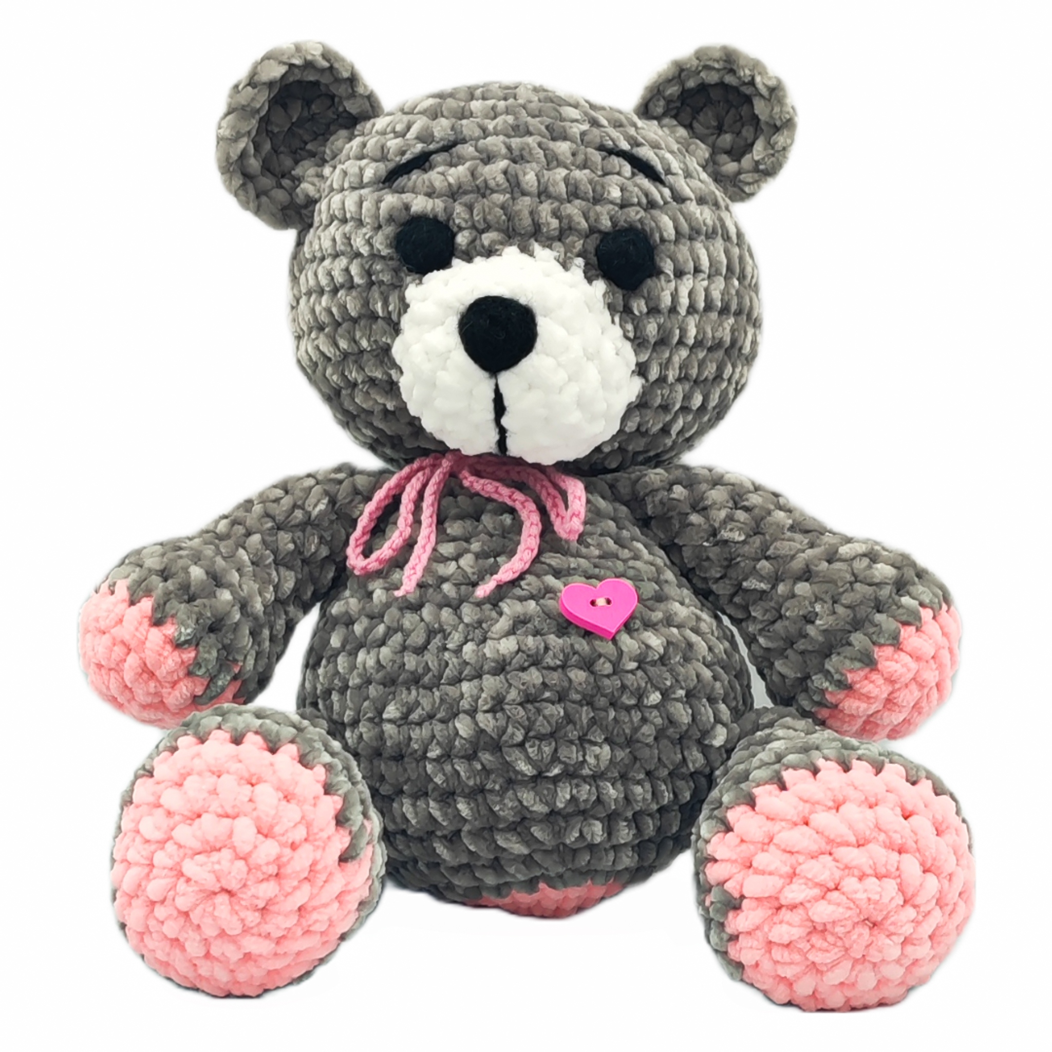 Наш очаровательный мишка выполнен в нежных серо-розовых тонах, с белой мордочкой и черными деталями. Благодаря своей конструкции она может сидеть, что позволяет разместить ее в любом месте, где она идеально впишется в дизайн интерьера.