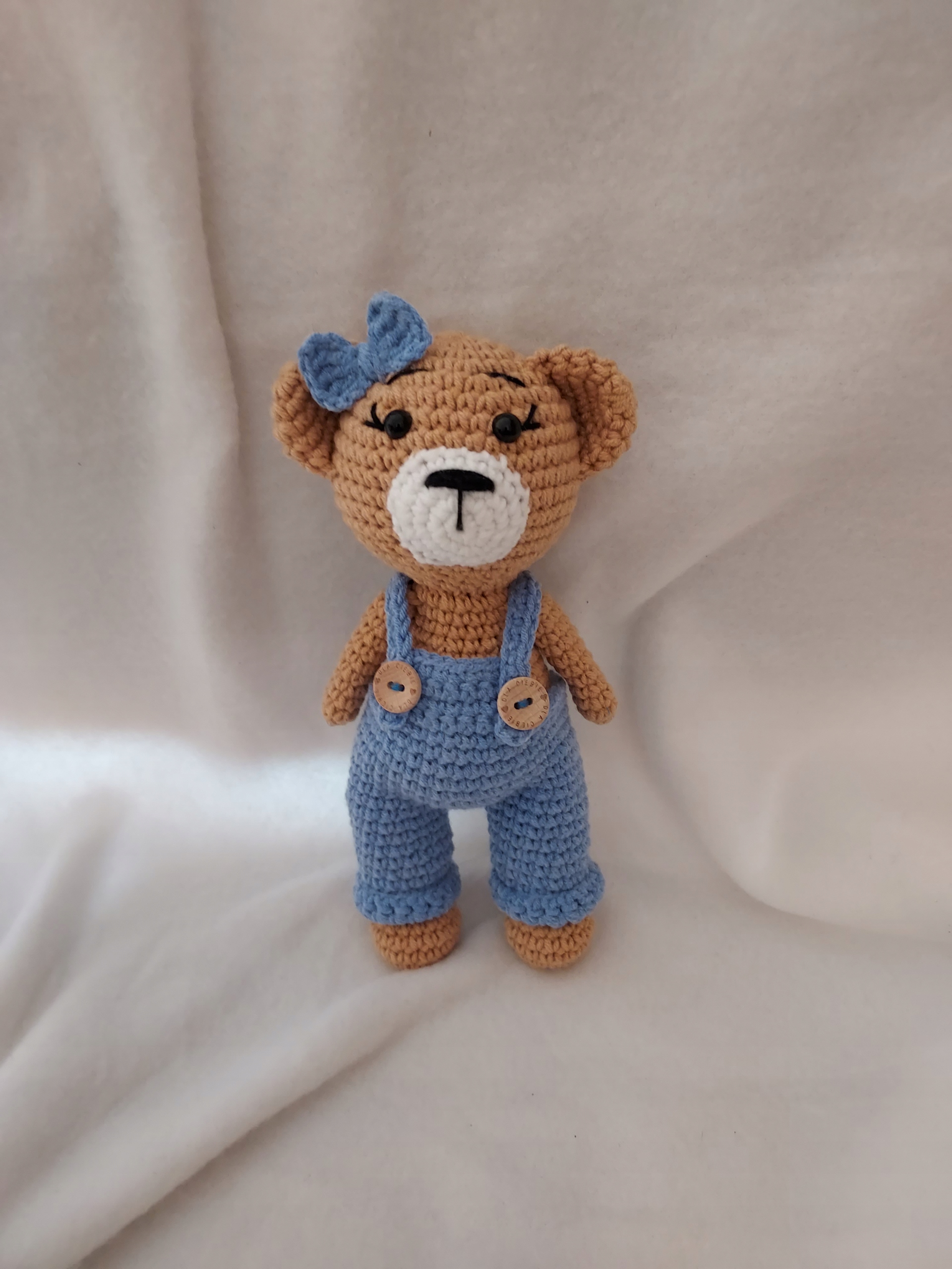 Талисман мишки Тедди связан вручную крючком в технике (амигуруми), наполнен противоаллергенным силиконовым шариком. Все выполнено из джинсовой пряжи YarnArt. Пряжа нежная и приятная на ощупь. Для безопасности ребенка глазки закреплены изнутри защелками. Светлый окрас без, шорты синие, шорты съемные, мордочка белая, бантик синий. Деревянные пуговицы. Работать можно при температуре 30 градусов, высота ок. 20 см. Другие талисманы, салфетки и скатерти вы можете найти в Alegro на месте