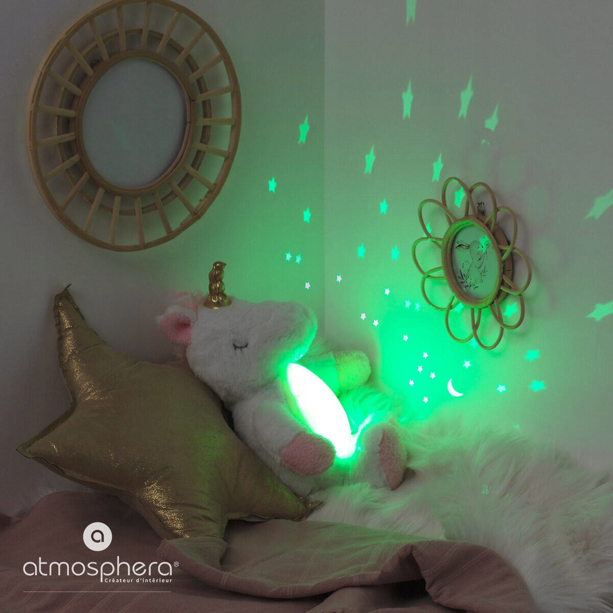 Мягкий проектор с подсветкой Unicorn, 34 см, от французского бренда Atmosphera для детей, излучает приятный теплый свет. Для питания требуются три общедоступные батарейки типа ААА (не входят в комплект). Оснащен тремя светодиодами. Максимальное энергопотребление — 1,5 В.