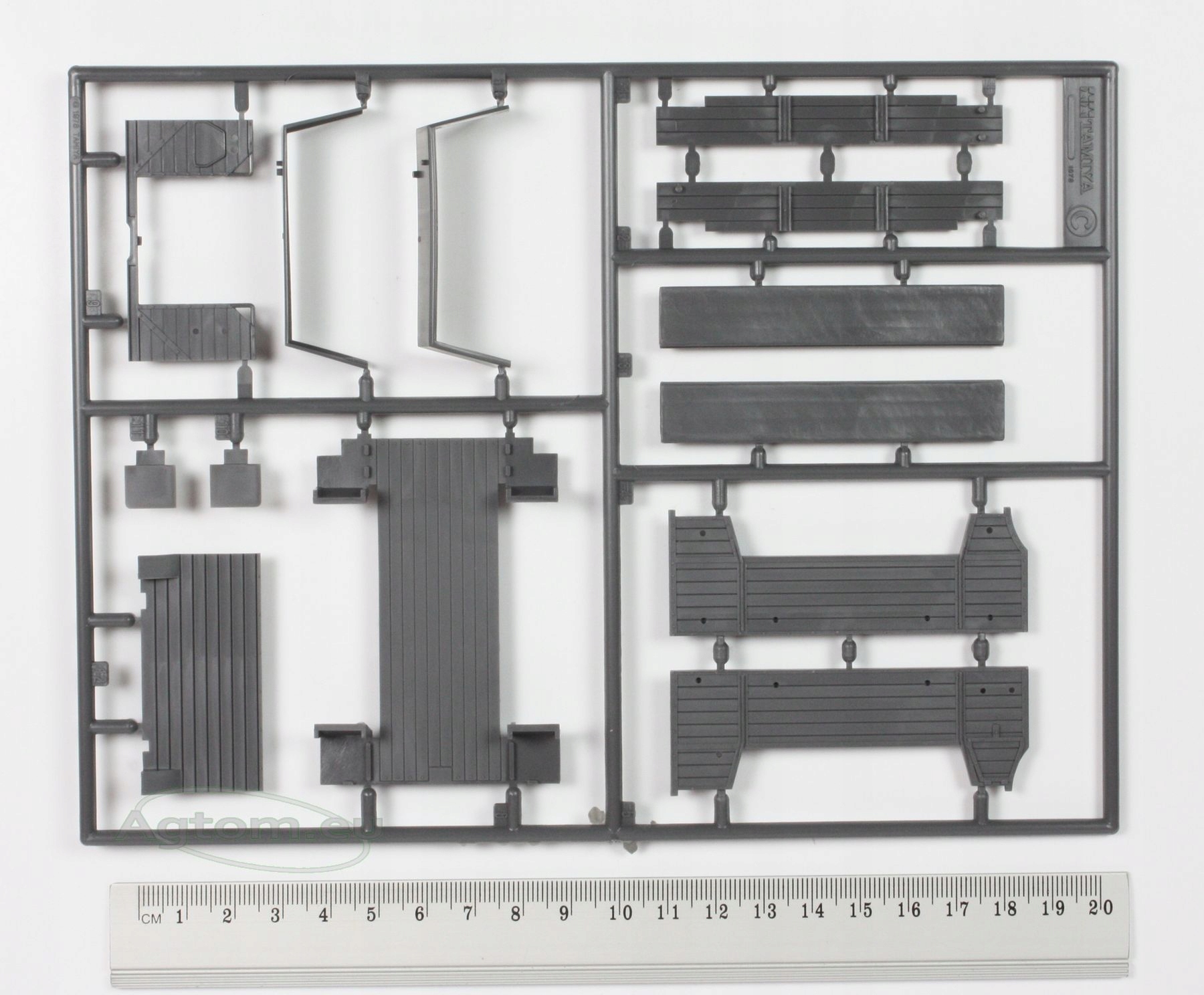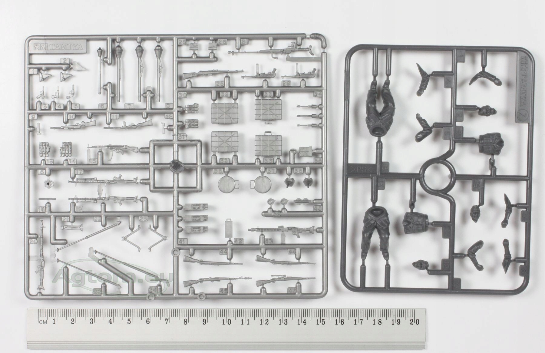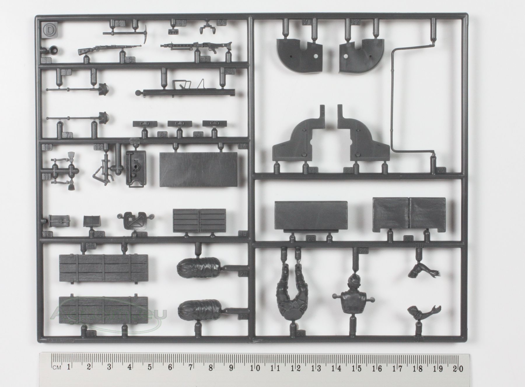 В коробке 5 литников с деталями, литник с оружием и припасами (содержит много редкого оружия, в том числе Pz.B.39, пистолеты-пулеметы Emma и Bergmann, а также MP40, STG44, MG 32 и 34, Kar98k в нескольких модификациях). , l.Gr.W.36, Panzershreck, Panzerfausts обоих типов, гранаты, ящики с боеприпасами, мины, канистры), проволока, прозрачное пластиковое окно и декали (позволяют реконструкцию машины из 11, 32 или 46-й стрелковой дивизии). , 4-я, 5-я или 21-я танковая дивизия).