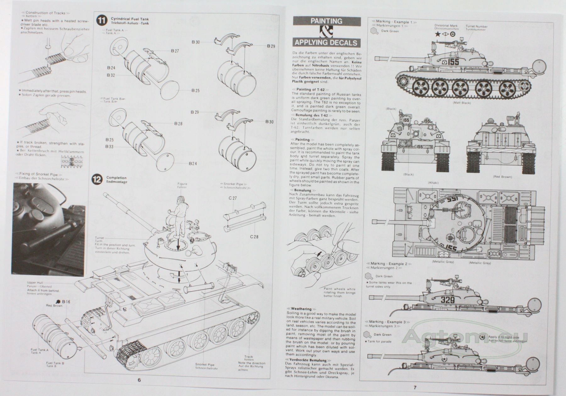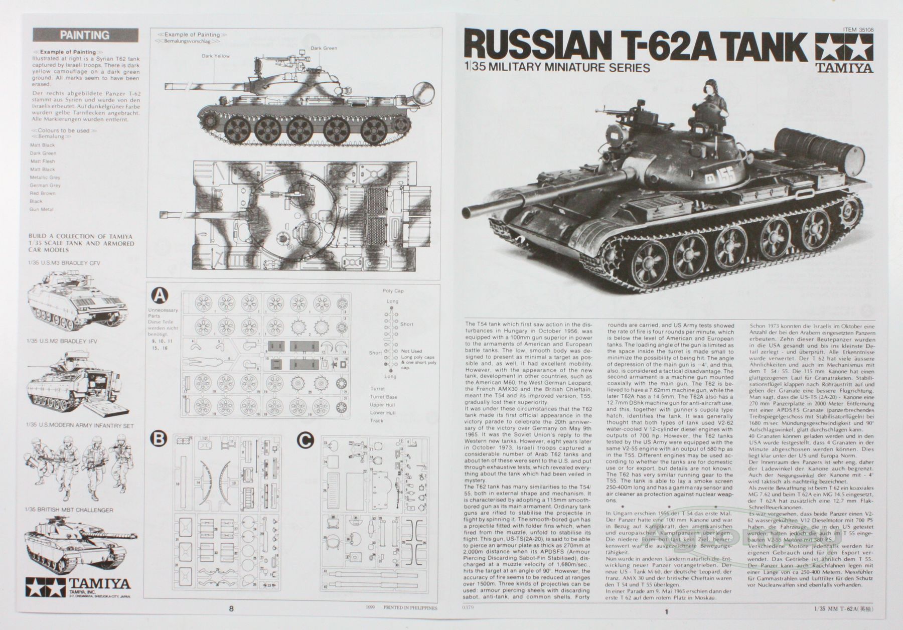 Набор Tamiya позволяет собрать и склеить советский основной боевой танк Т-62А вместе с командиром. В коробке находятся 2 элемента корпуса, элемент башни, 3 литника, резиновые гусеницы и декали.