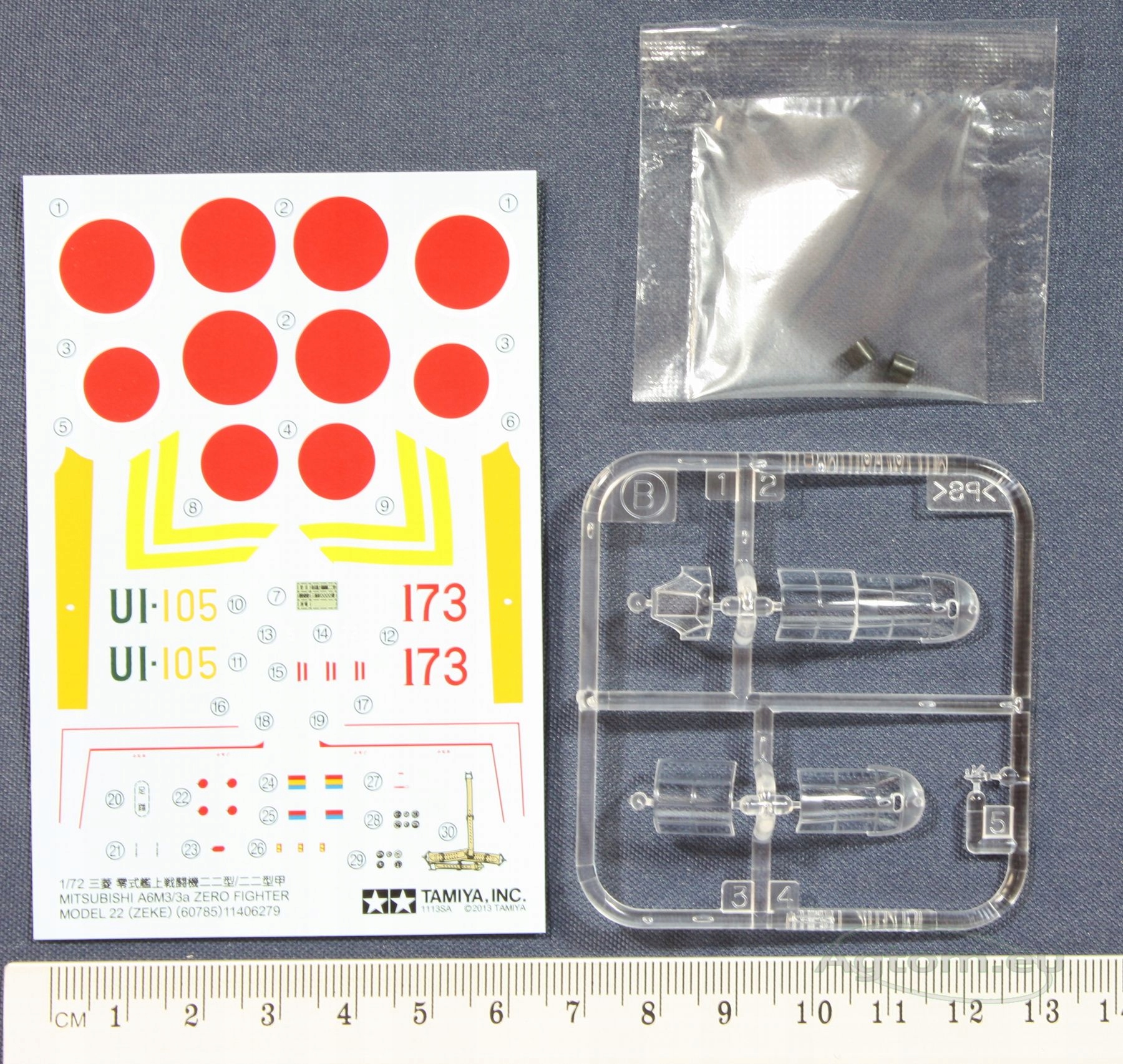 Набор, предложенный компанией Tamiya, позволяет собрать и склеить модель императорского японского истребителя Mitsubishi A6M3/3a Zero (Zeke). В коробке 2 литника с деталями модели, литник с прозрачными обтекателями (2 на выбор) и декали (позволяющие воссоздать самолет, на котором летал майор Сабуро Синдо).