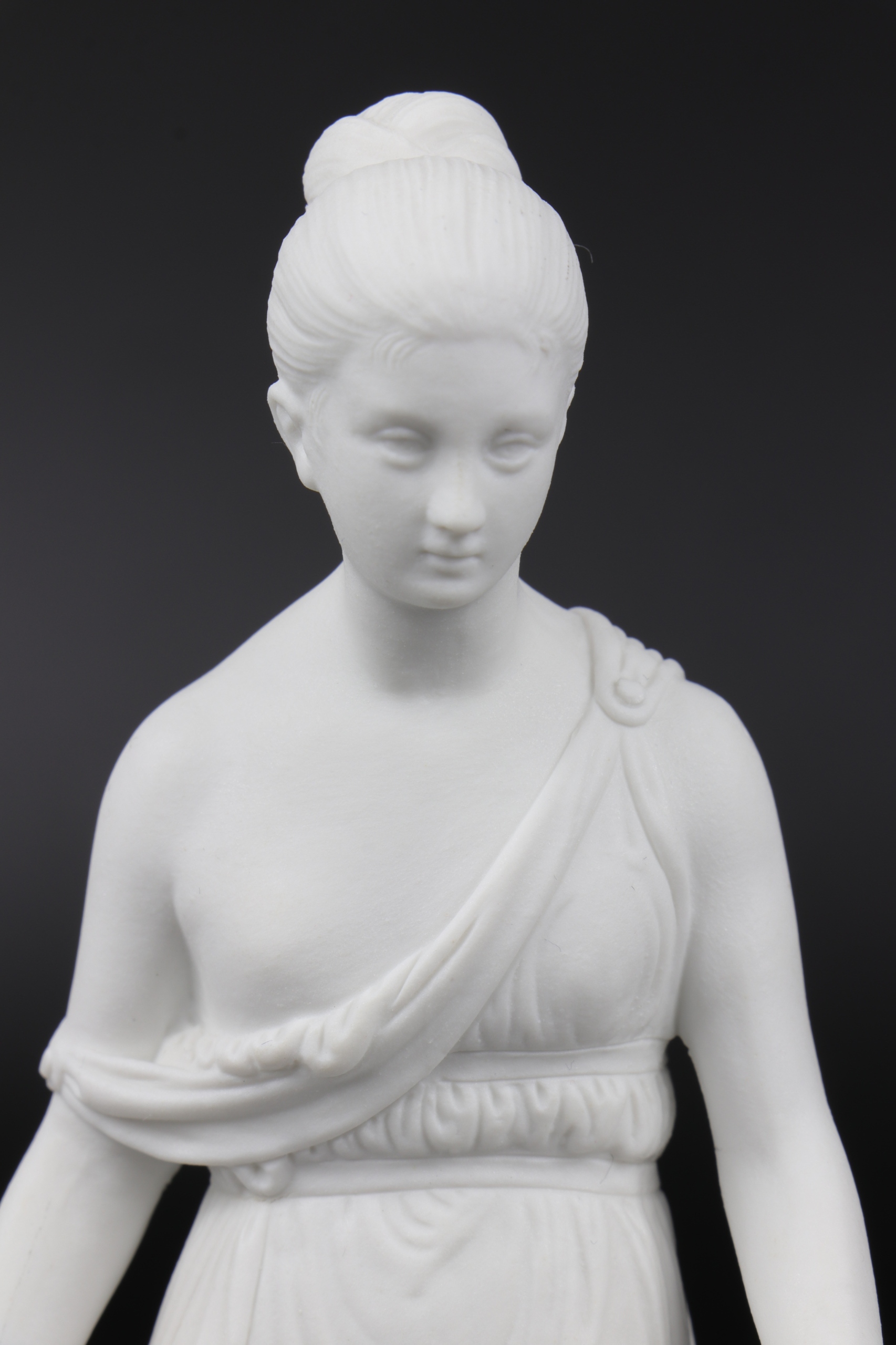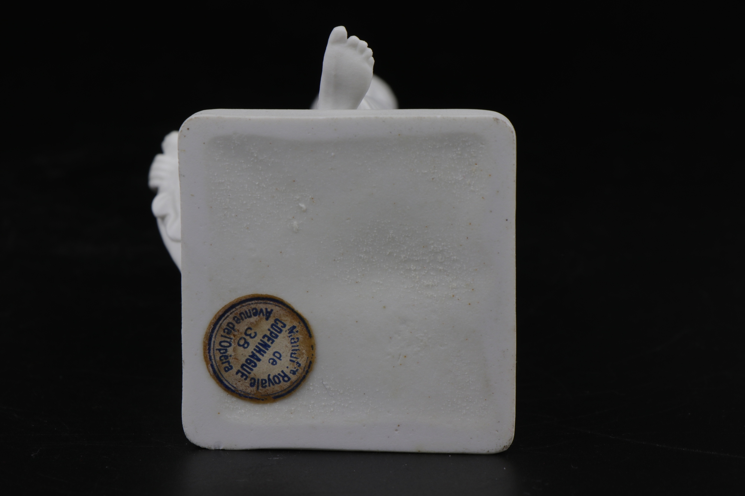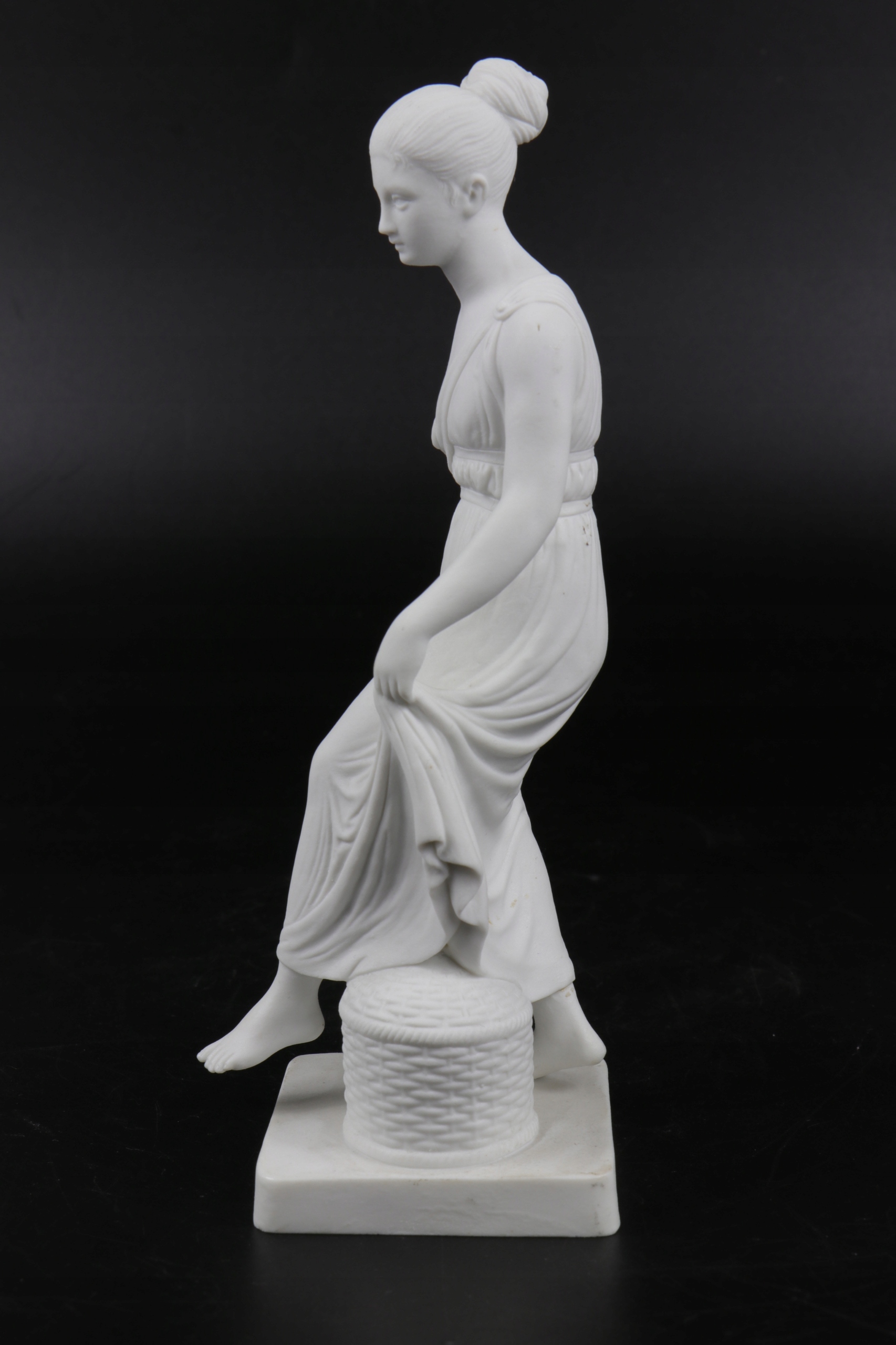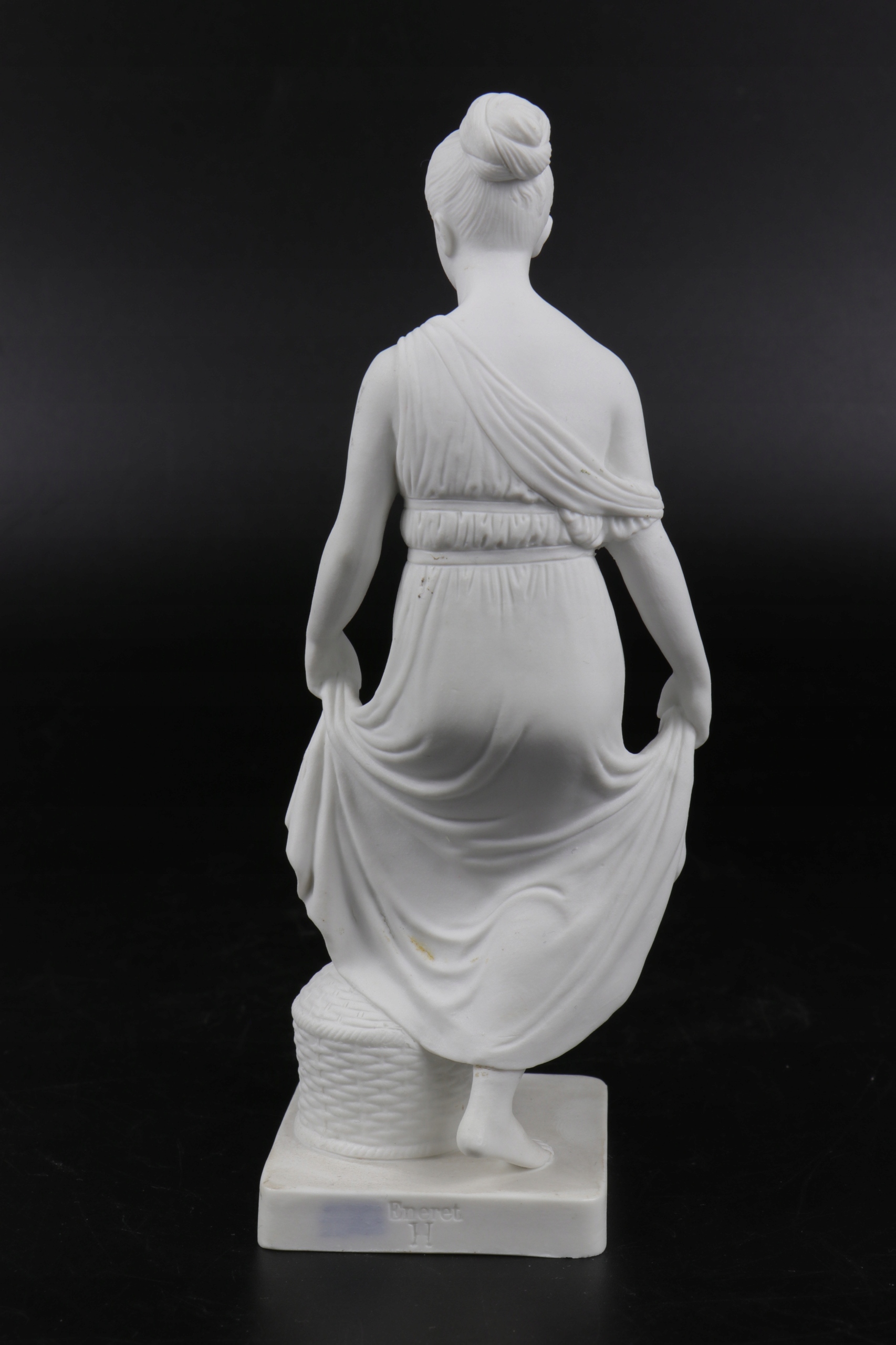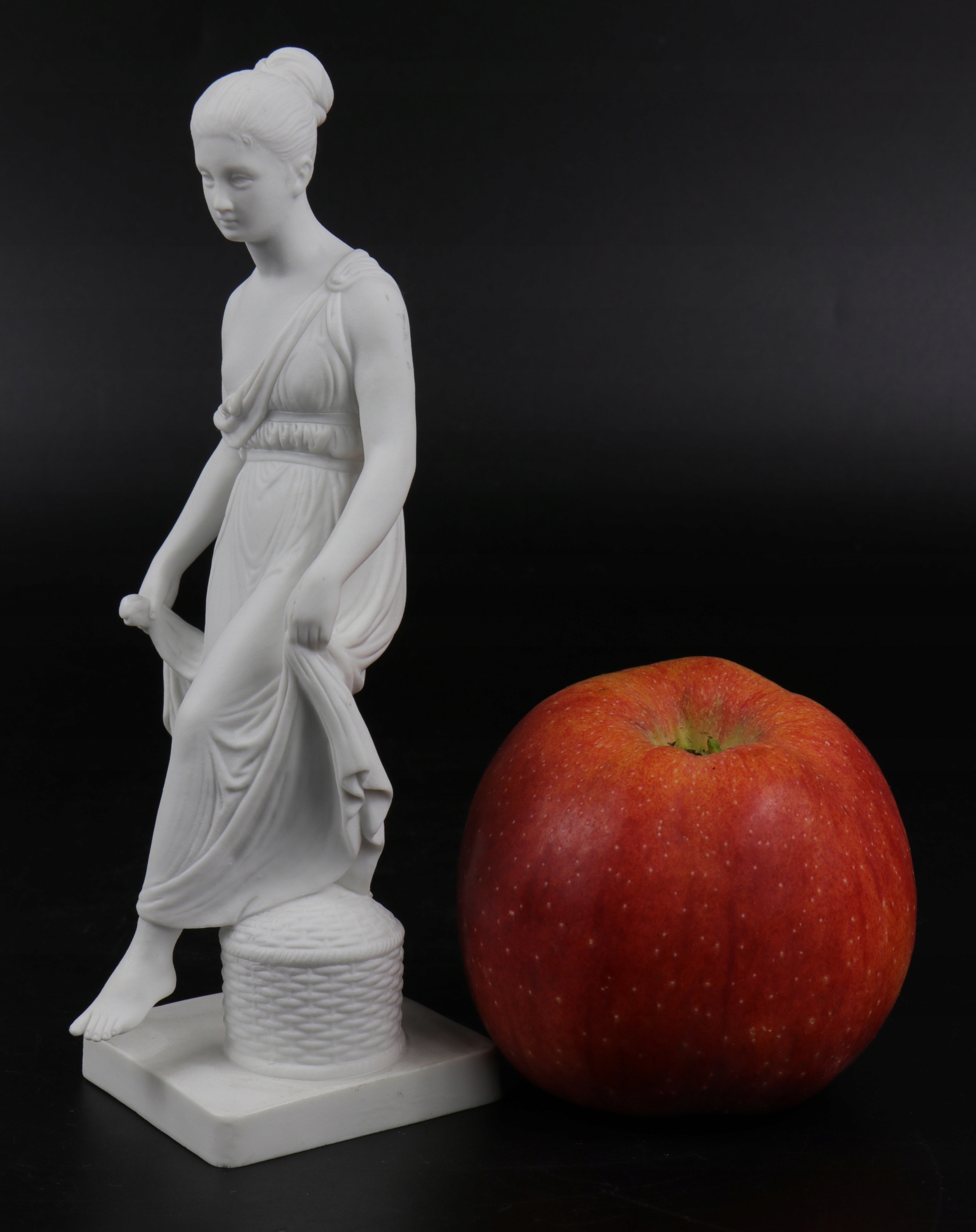 Бисквитная фигурка танцовщицы, созданная Бертелем Торвальдсеном (1770–1844), датским скульптором, представителем направления классицизма. Статуэтка подписана знаком Королевской Копенгагенской мануфактуры и оттиском Энерета. Белый бисквитный фарфор, имитирующий мрамор. На реверсе наклейка фирменного магазина королевской фабрики в Париже.