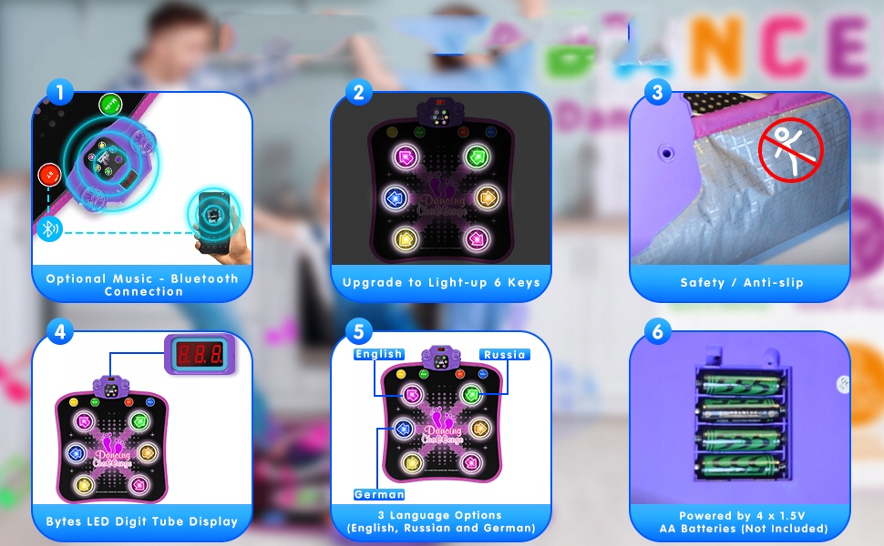 Наш танцевальный коврик может быть подключен к смартфону с помощью Bluetooth, поэтому вашим детям больше не нужно беспокоиться о песнях для танца. Вы можете играть все более и более интересные песни с мобильным телефоном, пусть ваши дети влюбится в Dance. Наша танцевальная площадка Bluetooth обеспечивает более широкий выбор песен во время танца. 4 батареи АА. (Не включен)