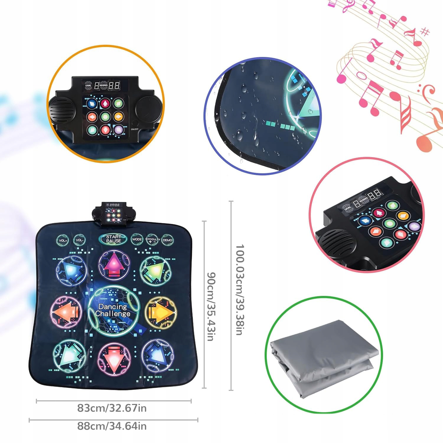 танцевальный коврик изготовлен из высококачественных материалов, устойчивых к частому использованию и интенсивным упражнениям. Он имеет мягкую подкладку, которая обеспечивает анти -SLIP, и панель дисплея, которая помогает указать другое движение.