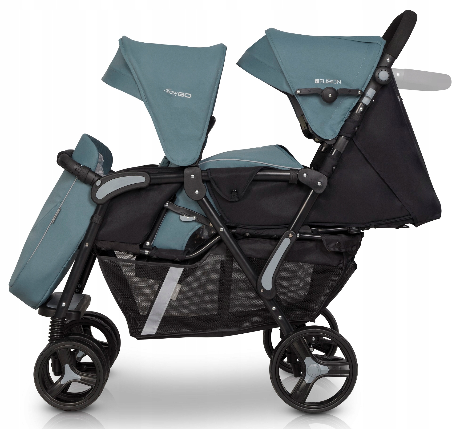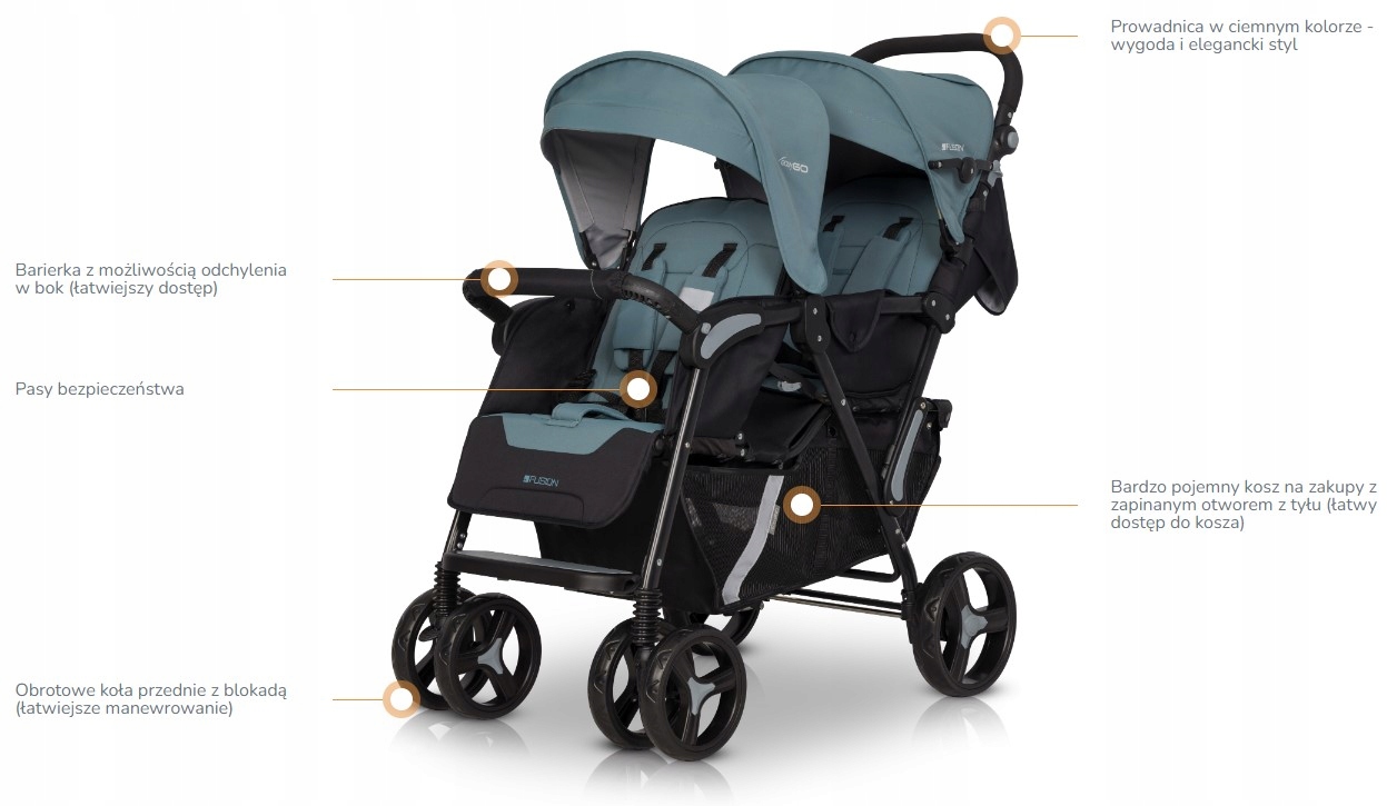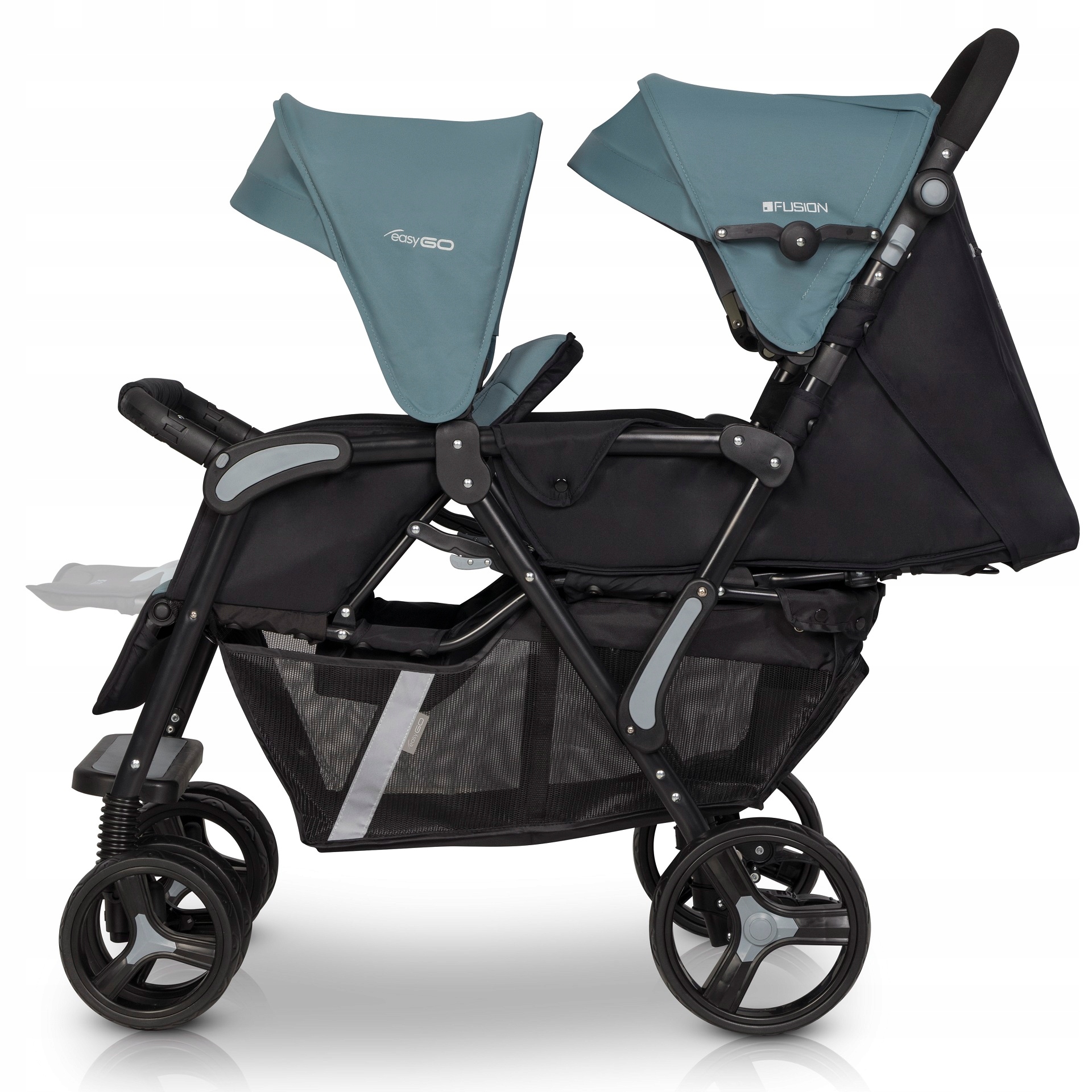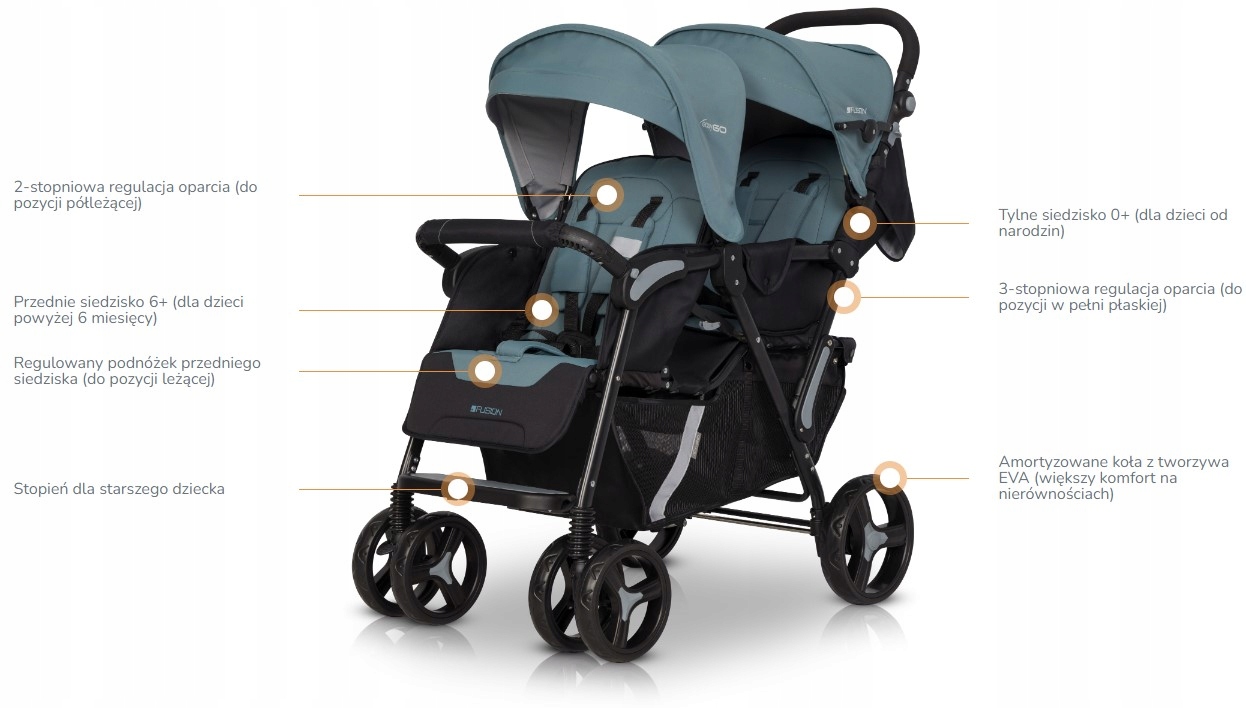 FUSION от EASYGO — коляска-тандем для близнецов или детей из года в год. Заднее сиденье предназначено для детей с рождения (0+) и имеет регулировку спинки до полностью горизонтального положения. Заднее сиденье также приспособлено для установки детской вставки (так называемой мягкой люльки), которая также доступна в нашем предложении. Переднее сиденье предназначено для детей от шести месяцев. Спинка регулируется в двух положениях. Подножка имеет полный диапазон регулировок от положения сидя до полностью лежачего положения. Дополнительная пластиковая ступенька на ножках обеспечивает комфорт и позволяет более взрослым детям самостоятельно садиться в коляску.