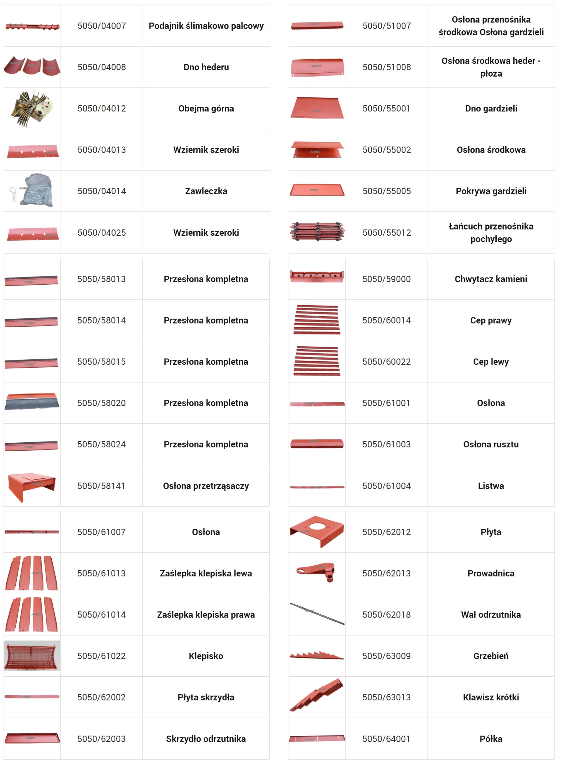 Уборочный блок (нижняя часть жатки старого типа, так называемая люблинская жатка) с салазками - корпус для Z-56 и Z-50 состоит из левой части корпуса 5055/ 01010 и правая сторона 5040/01031 и базовая коса 5055/01002. Под шнеком жатки находится нижняя часть жатки 5050/04008, а под ней правая крышка с полозьями 5050/01006, левая крышка с полозьями 5050/01007 и средняя крышка 5050/51008. Корпус уборочного агрегата 5053/01001 соединен со средней крышкой конвейера 5050/51007.
