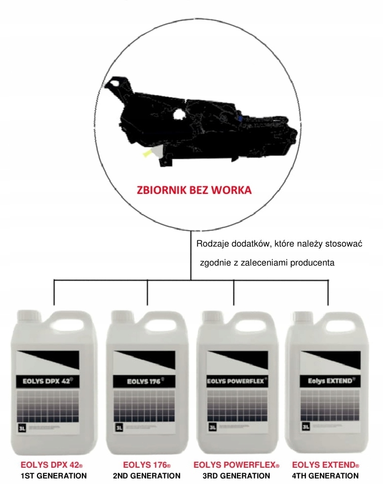 Существует два типа баков для присадок: с баком, состоящим из двух частей, с гибким мешком (запатентованная система AKWEL) и баком без мешка, требующим дозаправки жидкости. SEIM предлагает устройства для заправки баков без мешка для всех предыдущих поколений..